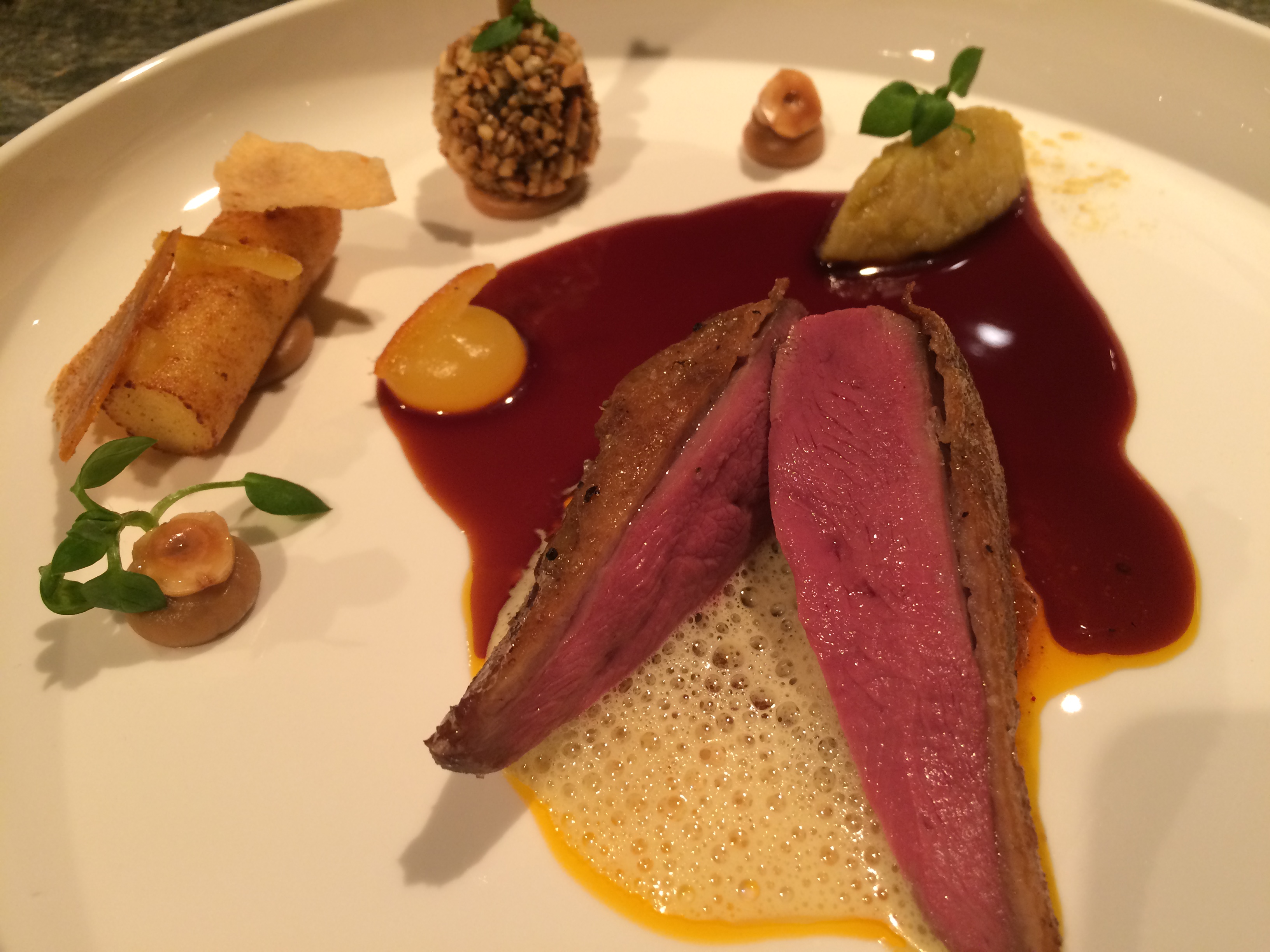 Nach der augenzwinkernden Erfrischung in Form eines hausgemachten Radlers, bei dem ein Granité von Yuzu- und andere Zitrusarten mit einem Münchner Craft-Beer aufgegossen wird, kommt mit der Imperial Taube ein Hauptgang an den Tisch, der unglaublich aufwändig und handwerklich perfekt gearbeitet ist. Die Brust sensationell zart, aber mit leichter krosser Haut, das Keulenfleisch hocharomatisch, in Nüssen gewälzt, eine Polentarolle, leicht angeröstet, diverse Pürees, etwas konfierte Zitrone und eine Sauce, die tief konzentriert am Gaumen bleibt. Kein Tropfen geht davon in der Sauciere wieder zurück in die Küche. Bravo!