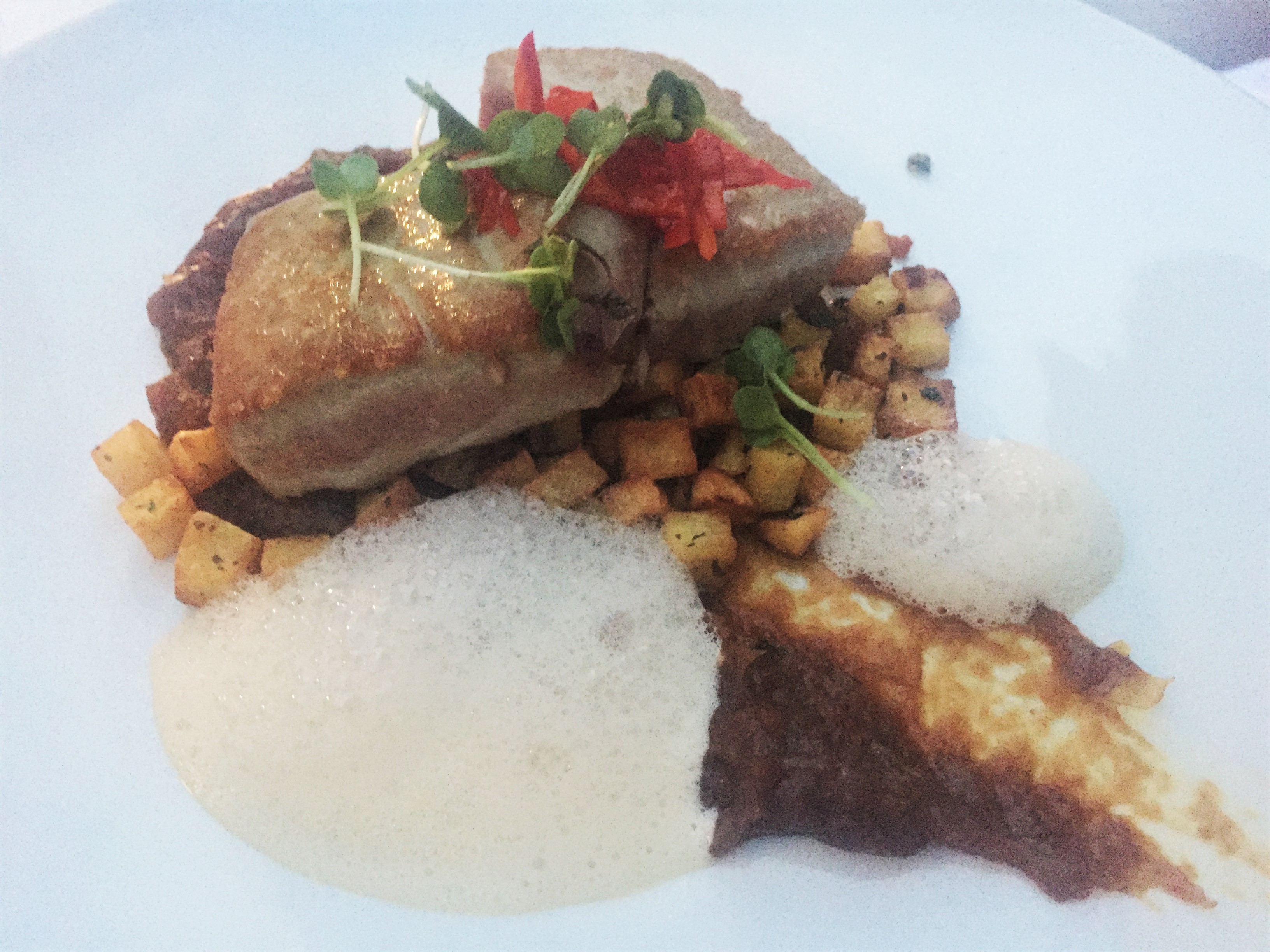 Ich erhalte dann Steinbeißer mit knackigem Gemüsejulienne. Beides gefällt mir gut. Nicht so glücklich werde ich jedoch mit den Kokos-Perlgraupen und dem Möhrenschaum. Beides hat einen für mich nicht identifizierbaren Ton, der sich etwas unharmonisch mit den übrigen Zutaten verhält. Der Pinselstrich auf diesem Teller wirkt leider arg grobmotorisch.