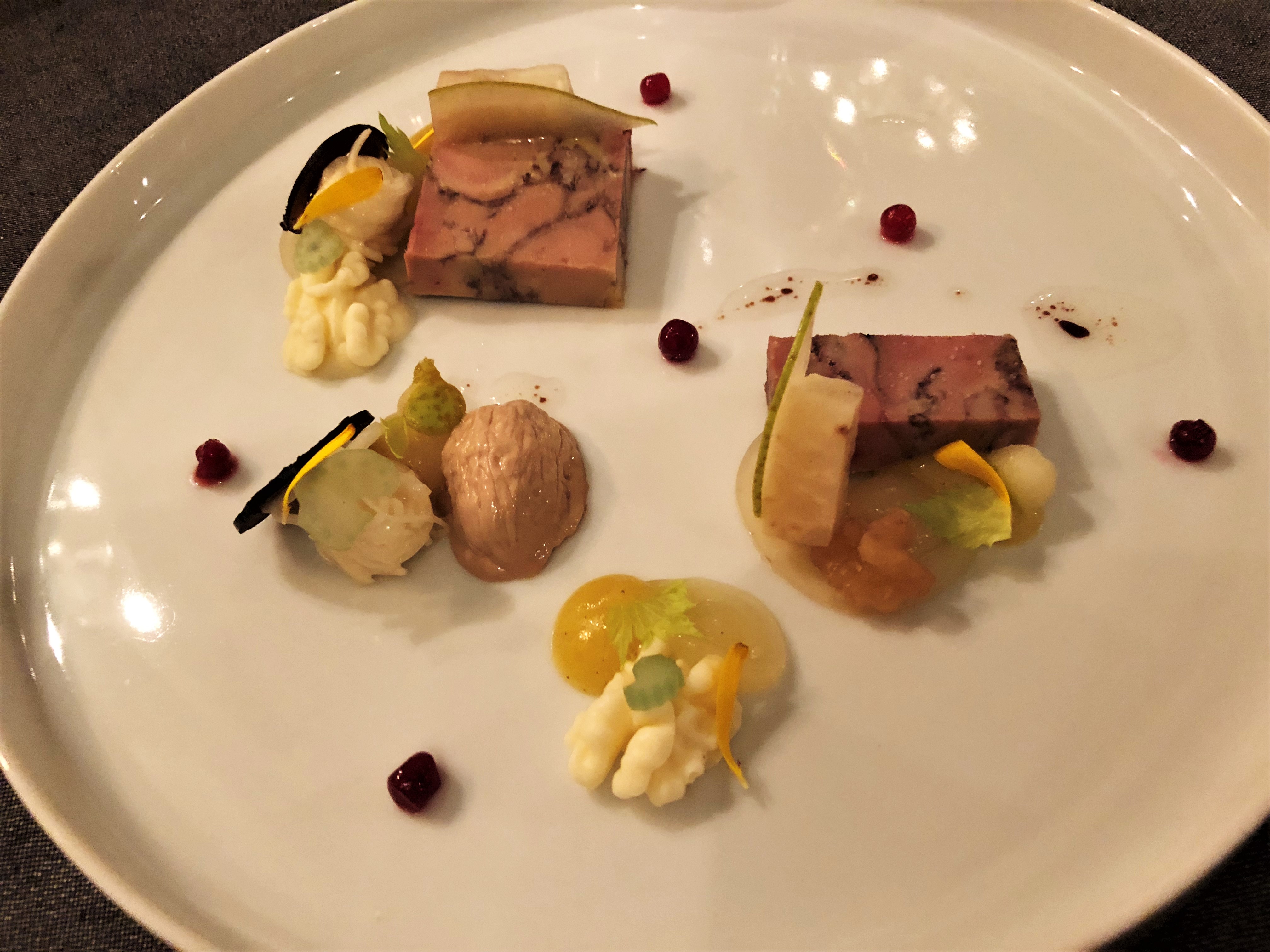Im „Courtier“ bietet Christian Scharrer ein Menü in 5 Gängen und eines in 6 bzw. 7 Gängen an. In unserem Arrangement erhalten wir ein 5 Gang-Menü, das sich aus beiden Abfolgen zusammen setzt und mit einer Variation von Gänseleber, Birne und Walnuss startet.