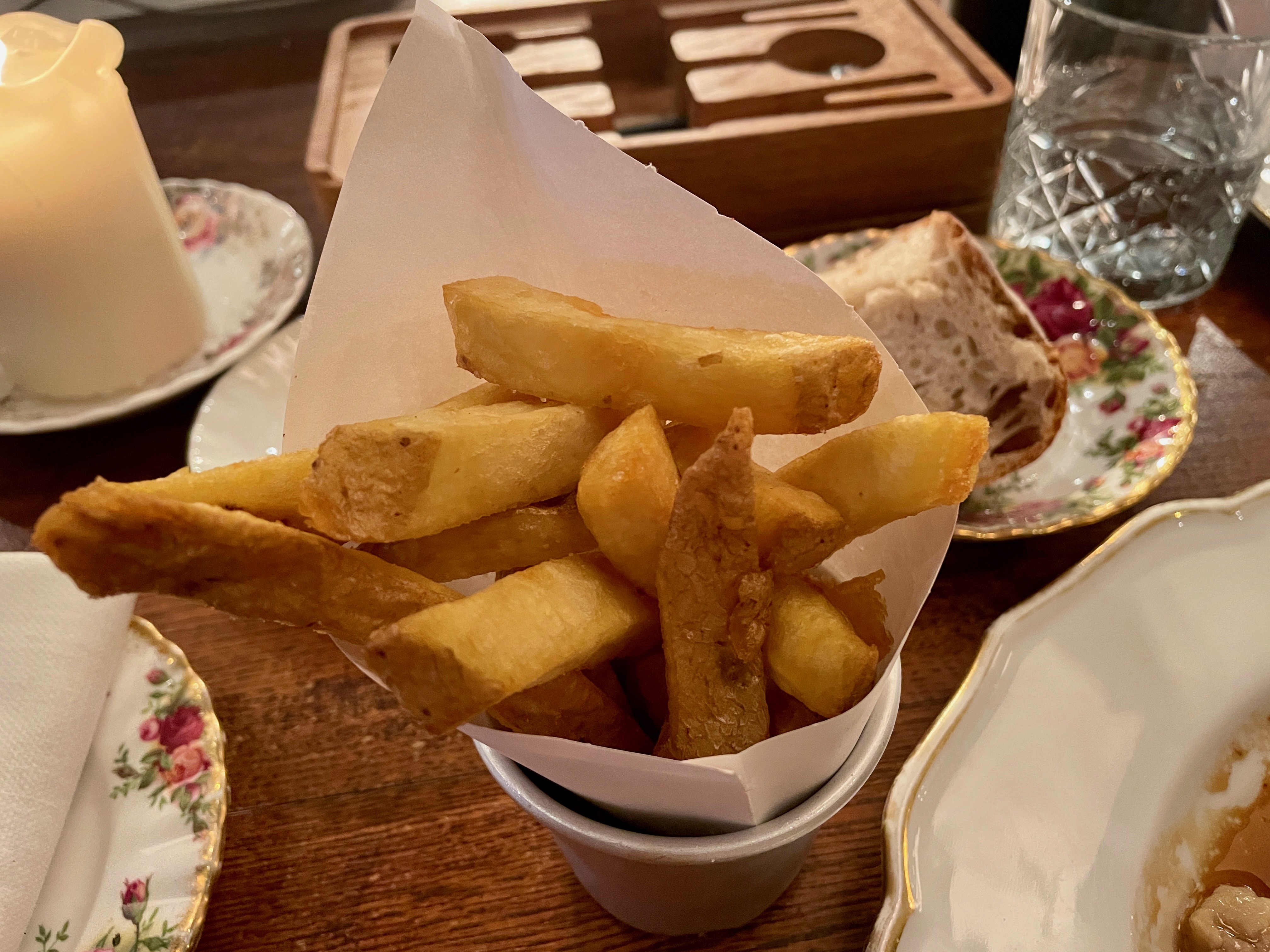 Für mich geht es mit Fleisch weiter und zwar einem Hanger Steak, auch bekannt als Onglet, einem von mir sehr geschätzten Stück vom Rind. Dies hier ist erwartungsgemäß perfekt gegrillt und mit einer Haube von Senfbutter und Knochenmark überbacken. Neben einem Zwiebelkompott gibt es in der recht naturbelassenen Jus auch noch reichlich Knochenmark, was zusätzliche Üppigkeit und Fülle beisteuert. Die hausgemachten Fritten samt Mayonnaise dazu sind knusprig und weich, also genau so, wie sie sein müssen. Aber hätte man bei unseren niederländischen Nachbarn auch etwas anderes angenommen?