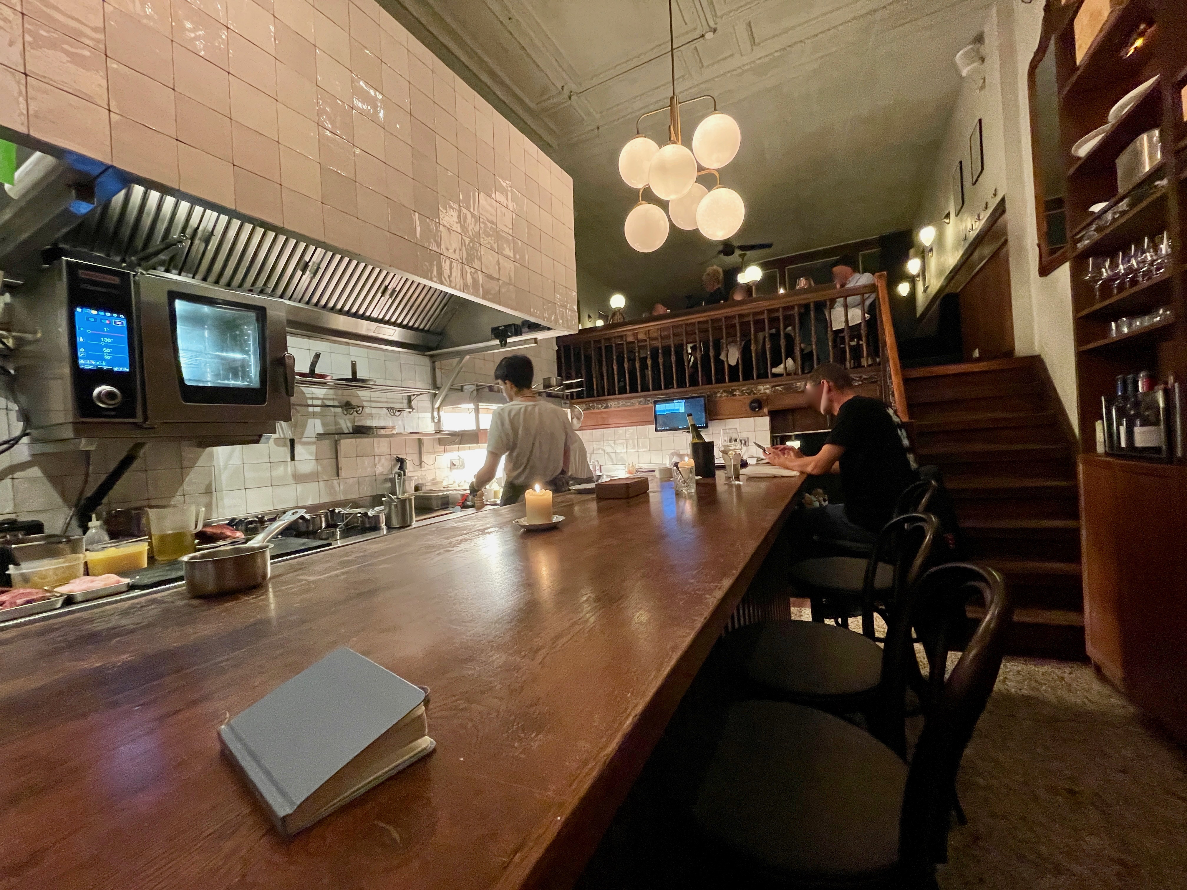 Zusätzlich zu den eher eng gestellten und kleinen Restauranträumen im Souterrain und auf der Empore gibt es noch einige Plätze am Tresen, die unsere Wahl sind. Wir lieben es einfach, das konzentrierte Arbeiten und die Abläufe zu beobachten. Dafür nehmen wir auch gerne in Kauf, dass es am Ende so eines Abends mit dem Lüften der Garderobe allein nicht mehr getan ist.