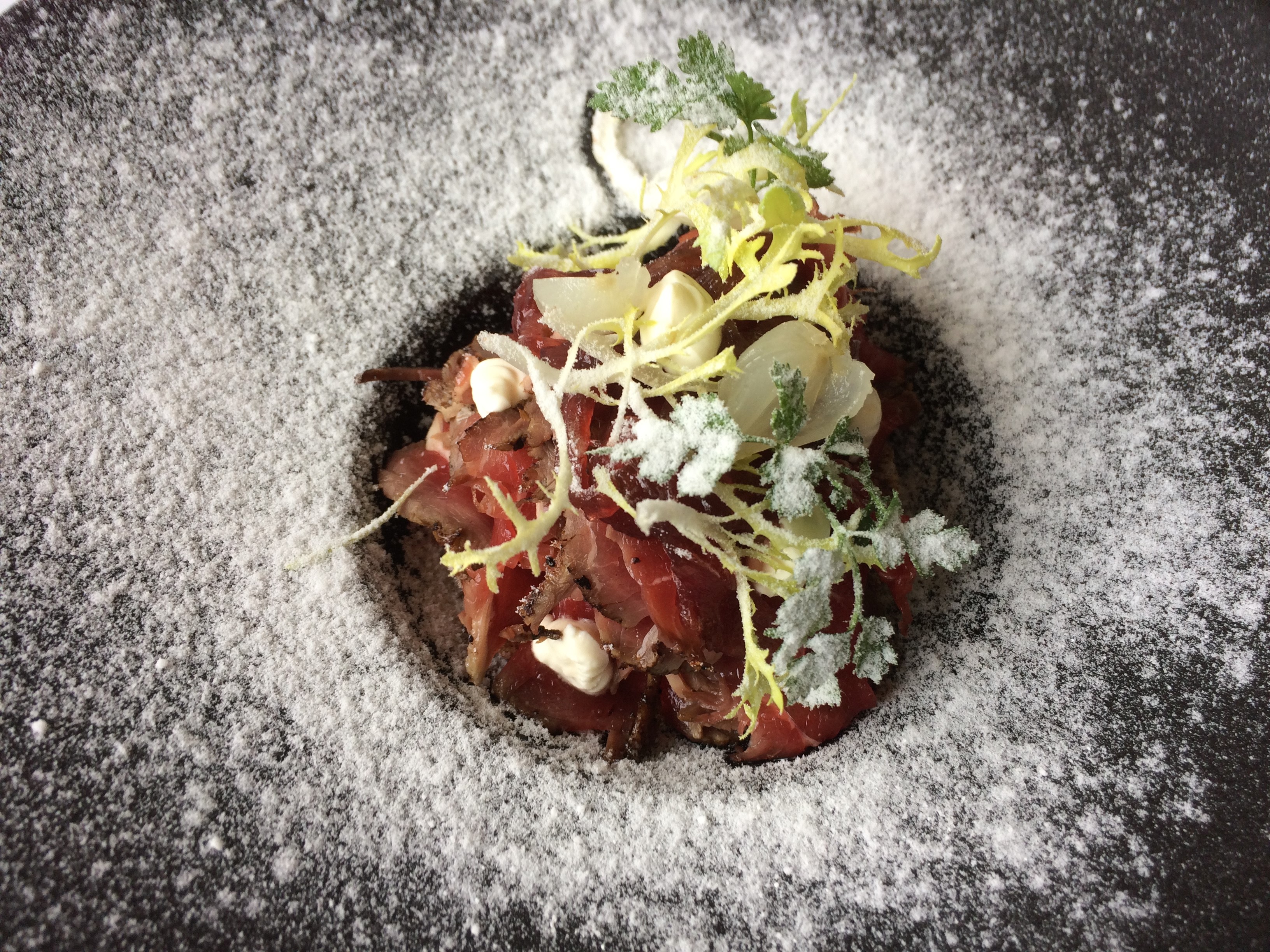 Ich starte mit gebeiztem Rinderfilet und lande gleich einen Haupttreffer. Die dünnen Scheiben sind zwischen Rotweinschalotten geschichtet. Tupfen von geräuchertem Frischkäse sorgen für Cremigkeit, ein Schnee von Essig steuert ganz dezente Säure bei. Das ist sehr gut und durchaus auf Sterneniveau.