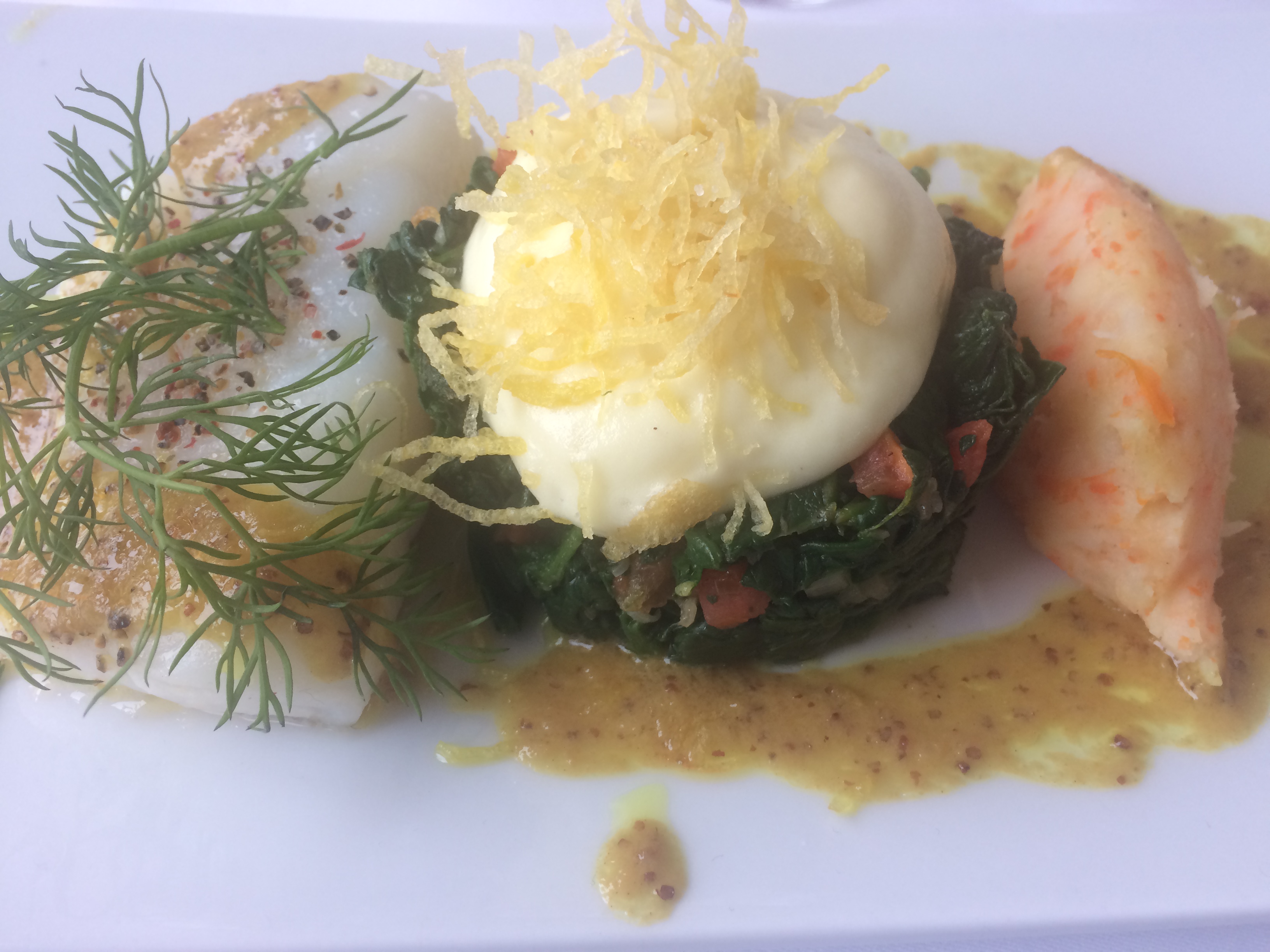 Im Hauptgang wählen wir beide Fisch, mein Gemahl den seit Urzeiten auf der Karte stehenden „J.P.’s Fischteller mit Ratatouile und Zitronengras-Curry-Sauce“ und ich den Rücken vom Angel-Kabeljau mit Blattspinat und Stampfkartoffeln. Dazu gibt es dreierlei Senfcreme, aber ich vermute, dass es eher eine Creme aus dreierlei Senf ist, denn irgendwelche Unterscheidungen kann ich auf dem Teller nicht ausmachen.