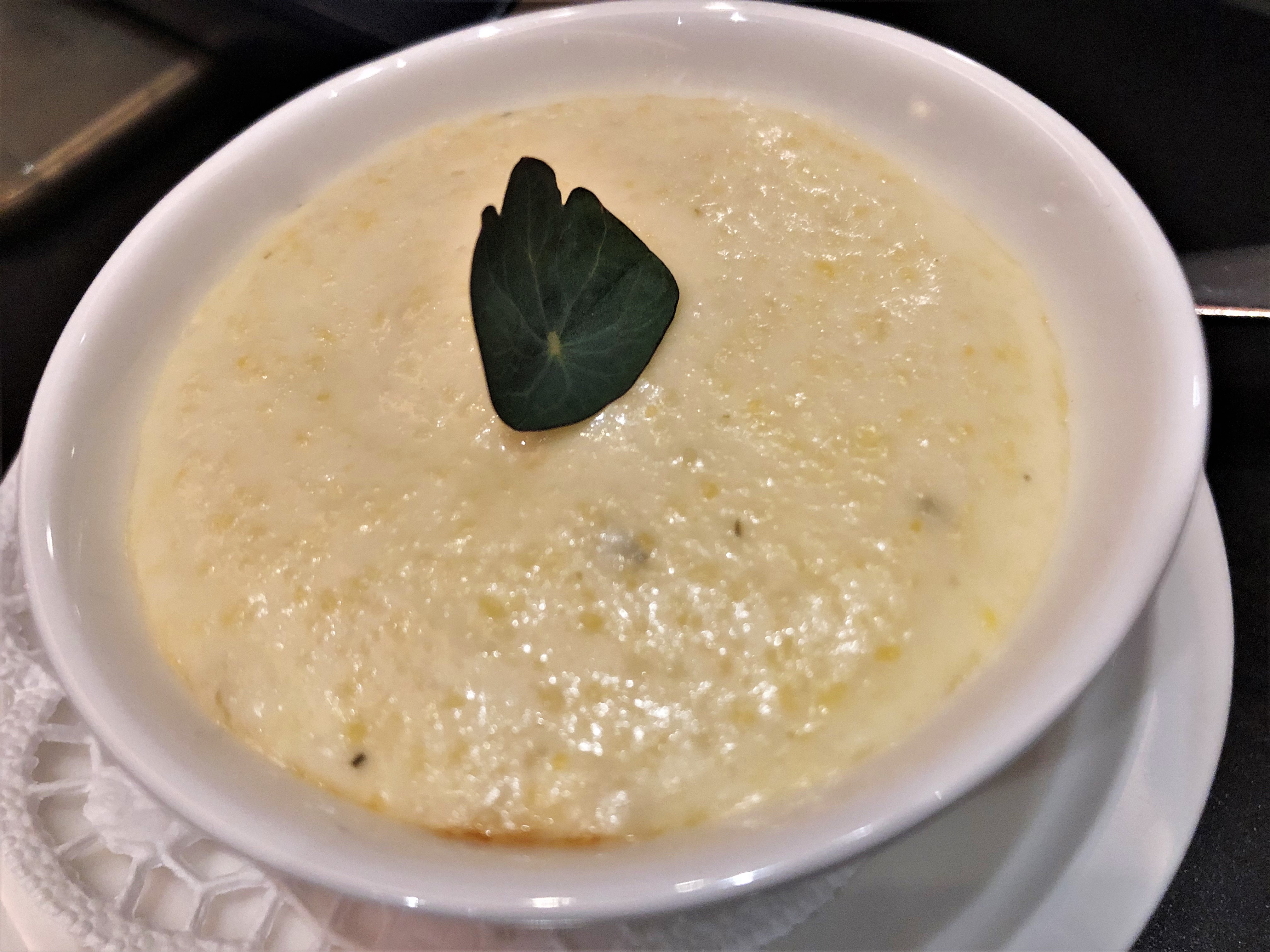 Zu den derzeit angesagtesten Zutaten in der Spitzenküche gehört der japanische Koshihikari Reis. Vor allem aus der Region Niigata gehört er auch zu den kostspieligsten Sorten. Eben dieser wird hier als Risotto zubereitet mit Pfifferlingen, und auch hier nur die allerfeinsten und kleinsten Exemplare. Ein feiner Trüffelton zieht sich durch das Gericht und ich vermute ein sehr gutes Öl, aber Jérôme Pourchère erläutert, dass aus den marinierten Schalen ein intensiver Sud gezogen wird, der dann auch außerhalb der Saison als Würzmittel verwendet werden kann. In jedem Fall ist das Risotto ausgezeichnet, kräftig gewürzt und liefert mit dem gepufften Reis zudem einen schönen Texturkontrast.