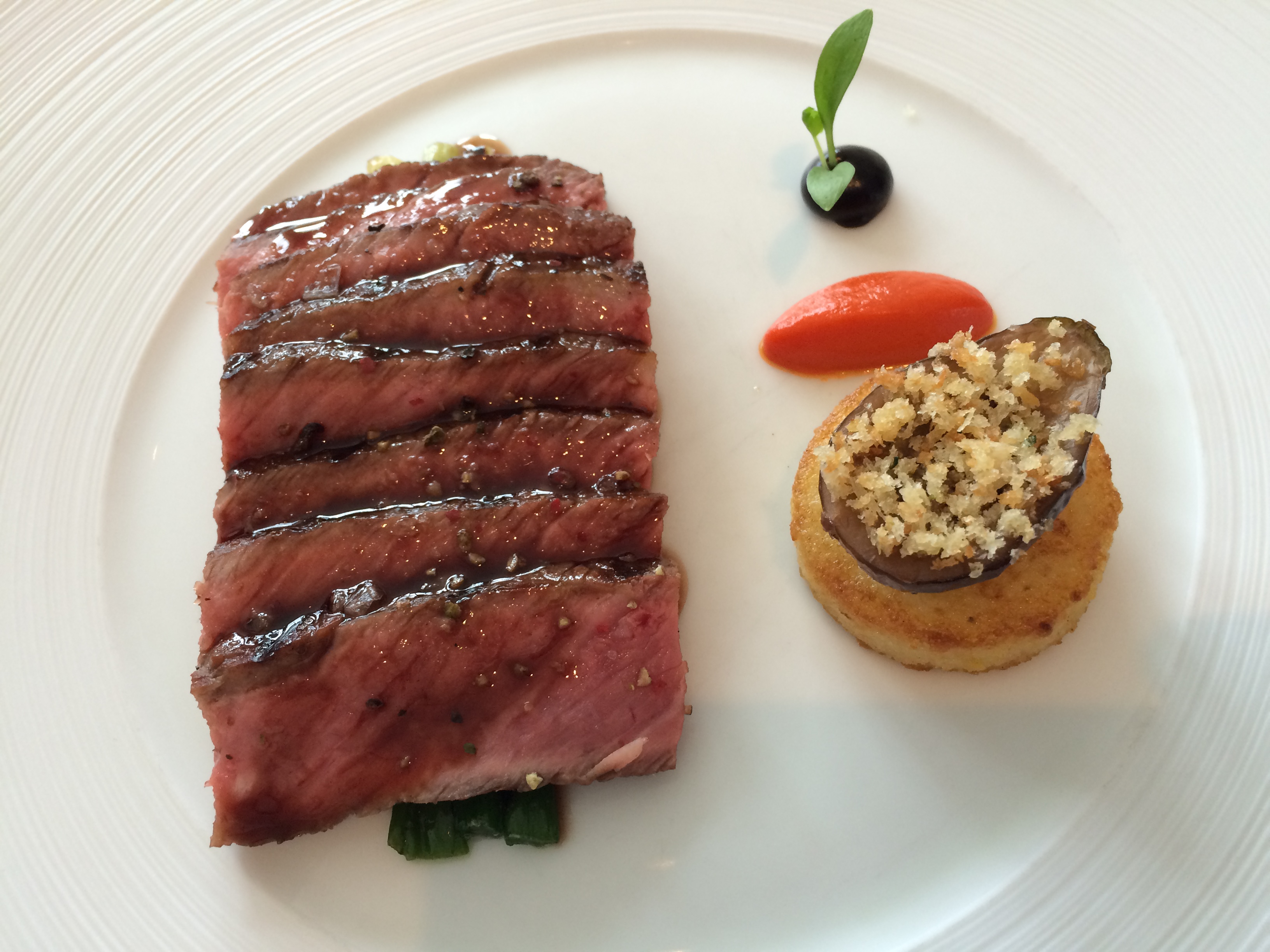 Im Hauptgang gibt es Entrecôte vom US-Beef mit Polenta, Baby-Artischocke, Paprikapüree und fermentiertem Knoblauch. Dazu eine tiefdunkle, intensive Jus mit Chili, die einen deutlichen, aber nie dominanten Hauch Schärfe beisteuert.