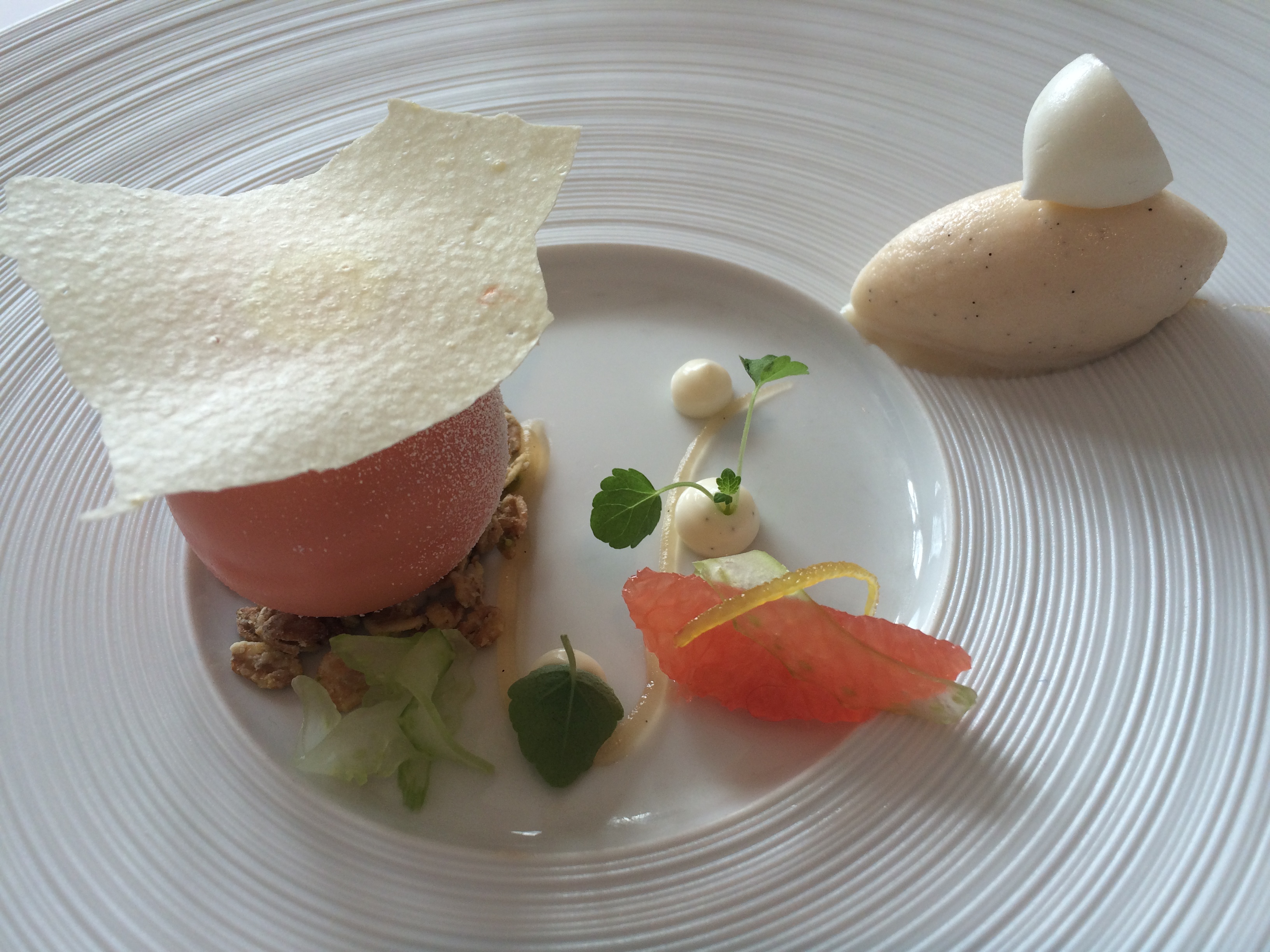 Zum Abschluss des Menüs wird aus dem aktuellen großen Degustationsmenü eines der Desserts serviert, das „Délice und Cocktail von der Pampelmuse mit Joghurt und Staudensellerie“ betitelt ist. Hauptelement auf dem Teller ist die mit gefüllte Kugel, dazu ein Cremeeis, im Glas à part dazu Joghurt als Schaum, verbindende Komponenten sind knuspriges Müsli und hauchdünne Streifen vom Sellerie, die nur ganz dezent einen gemüsigen Kontrapunkt setzen. Das ist gekonnt, abwechslungsreich, macht Spaß und lässt das Menü federleicht ausklingen.