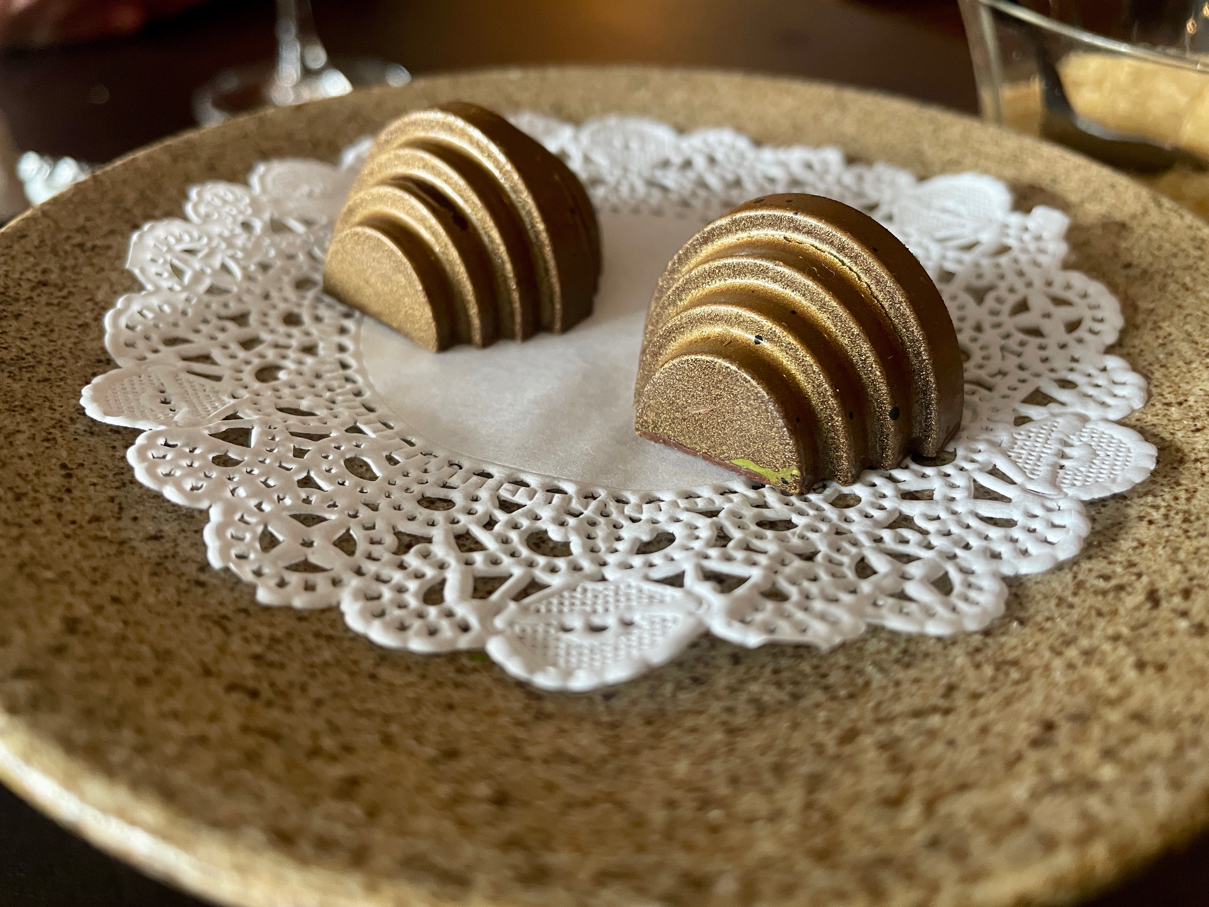 Zum Kaffee gibt es dann noch eine Praline von Vanille und Tonkabohne sowie ein Baba au Rhum. Der ist in einem Weckglas bereits eingelegt und entsprechend vollgesogen. Mit etwas Kardamomsahne ist das nicht nur lecker, sondern ersetzt auch problemlos den Digestif.