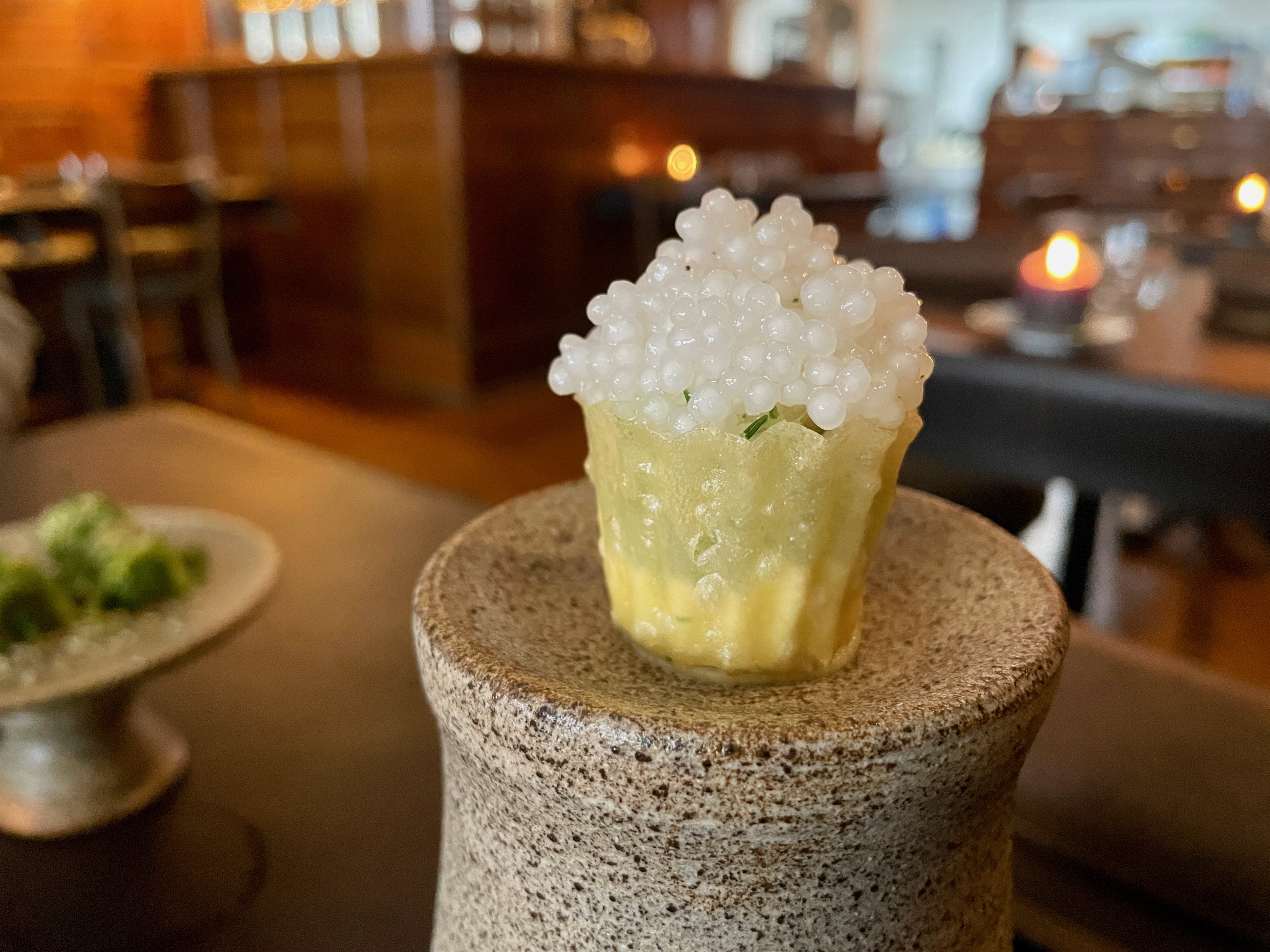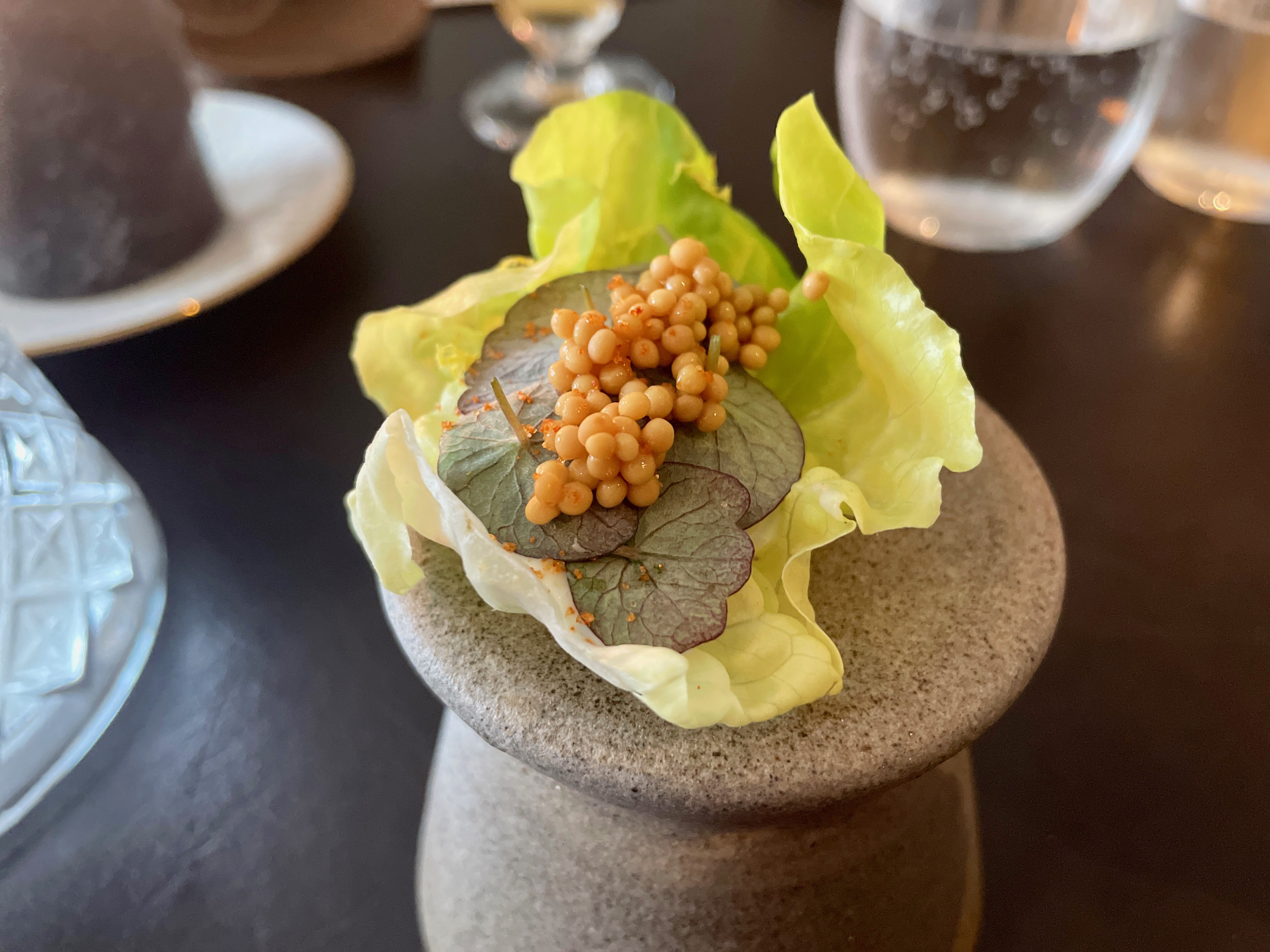 Aromatisch legt der nächste Gang noch mal einen Zahn zu. In einem Sud aus Pilzen und Algen finden sich Scheiben von roher Jakobsmuschel und gebackene Entenleber. Dazu gibt es einen salzigen Salat von vor allem Trüffelseetang, einer Rotalgenart, die tatsächlich einen Hauch von Trüffelgeschmack mitbringt. Optisch vielleicht nicht auf den ersten Blick ein Gewinner, ist der Salat wirklich großartig und unterstützt den vollen Umami-Charakter ganz ausgezeichnet.