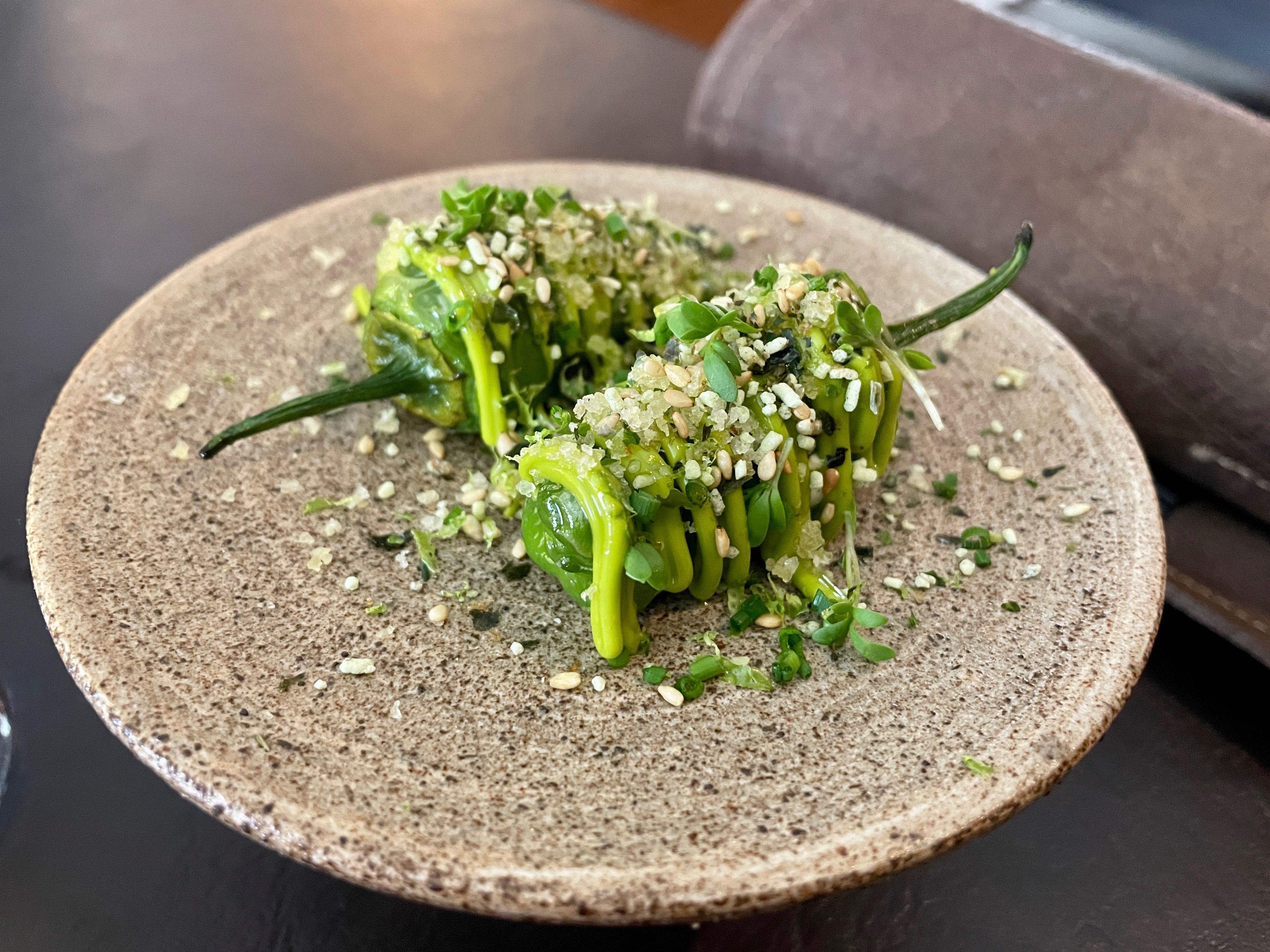 Und das startet mit drei vegetarischen Snacks als Fingerfood. Ein knackiges Kopfsalatblatt mit einer Dillcreme und Kapuzinerkresse strotzt vor Frische, während eine Croustade mit Frühlingszwiebeln und ebenfalls einer Creme vor allem markante Zitrusnoten aufweist. Pimientos wiederum sind mit einer Meerrettichcreme gefüllt, die eine schöne pikante Schärfe zeigt.