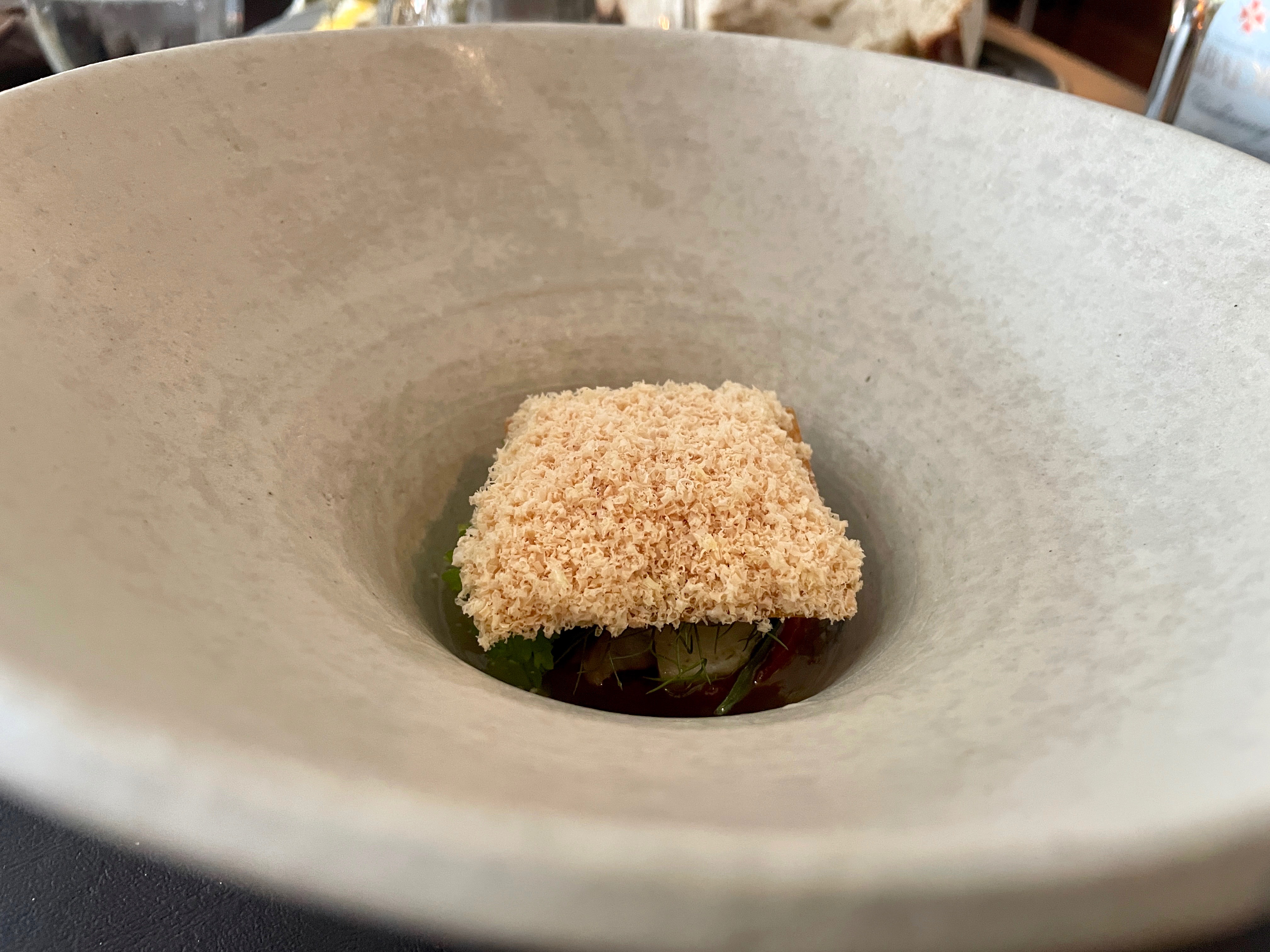 Der erste Gang des Menüs stellt Hamachi aus Zeeland in den Mittelpunkt als Tatar und Ceviche. Eine Salsa aus Mais und Ananas steuert nur dezente Fruchtigkeit bei, dafür etwas Textur. Ein prägnanter Sud von grünen Tomaten rundet das Ganze sehr ausgewogen ab. Im Nachgang macht sich noch eine ganz leichte Schärfe breit, die aber überhaupt nicht unangenehm ist. Ein runder und guter Auftakt.