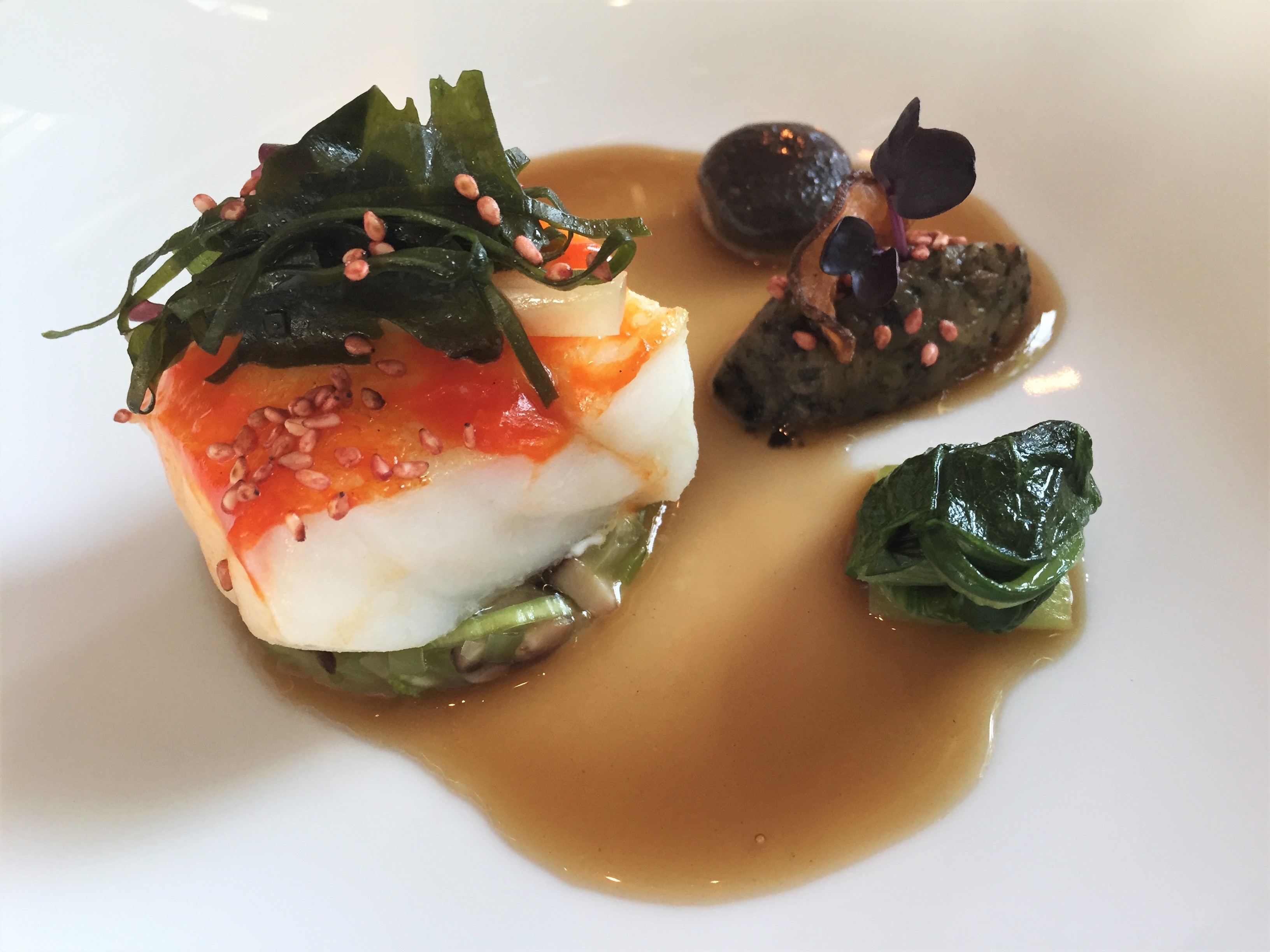 Der folgende Gang liest sich vergleichsweise unspektakulär und wirkt auch auf dem Teller relativ aufgeräumt. Allerdings sollte man sich davon nicht täuschen lassen, denn ob es der Pakchoi oder das Auberginenconft ist – die Beilagen sollen hier bewusst die Nebendarsteller sein, um dem perfekt gebratenen bretonischen Steinbutt die Bühne zu überlassen. Auch die angegossene, leicht gebundene Shiitakebouillon unterstreicht nur, dass hier das Produkt der Star ist.