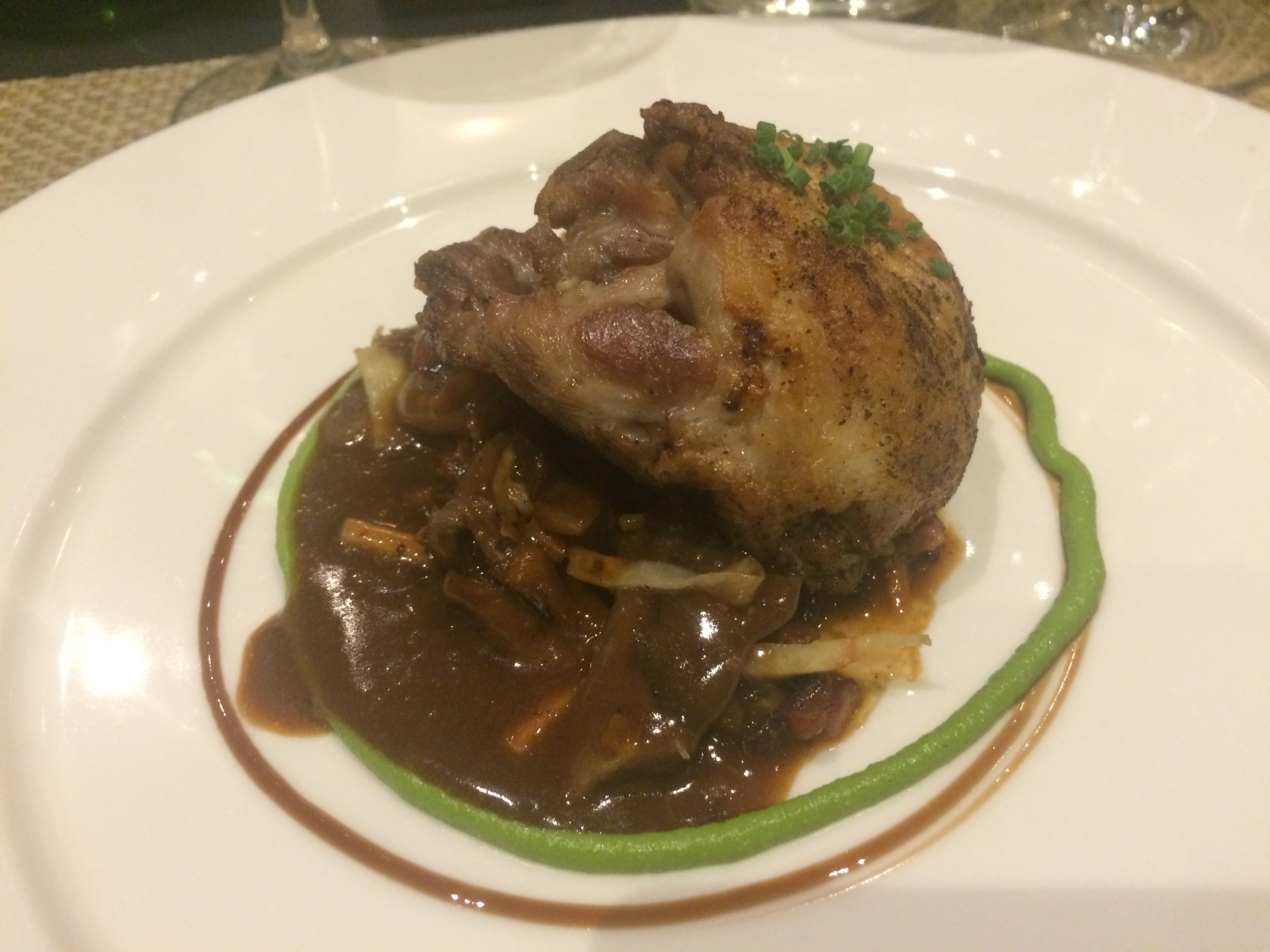 Und dann kommt die ausgelöste Wachtel auf einem Ragout von Perlzwiebeln und Pilzen in einer ungemein schlotzigen, kräftigen Schmorsauce. Und ich bin begeistert. Das ist Bistroküche vom Feinsten, mutig gewürzt und handwerklich sehr gut gemacht. Wachteln auszulösen ist jetzt auch nicht das, was ich jeden Tag machen müsste.