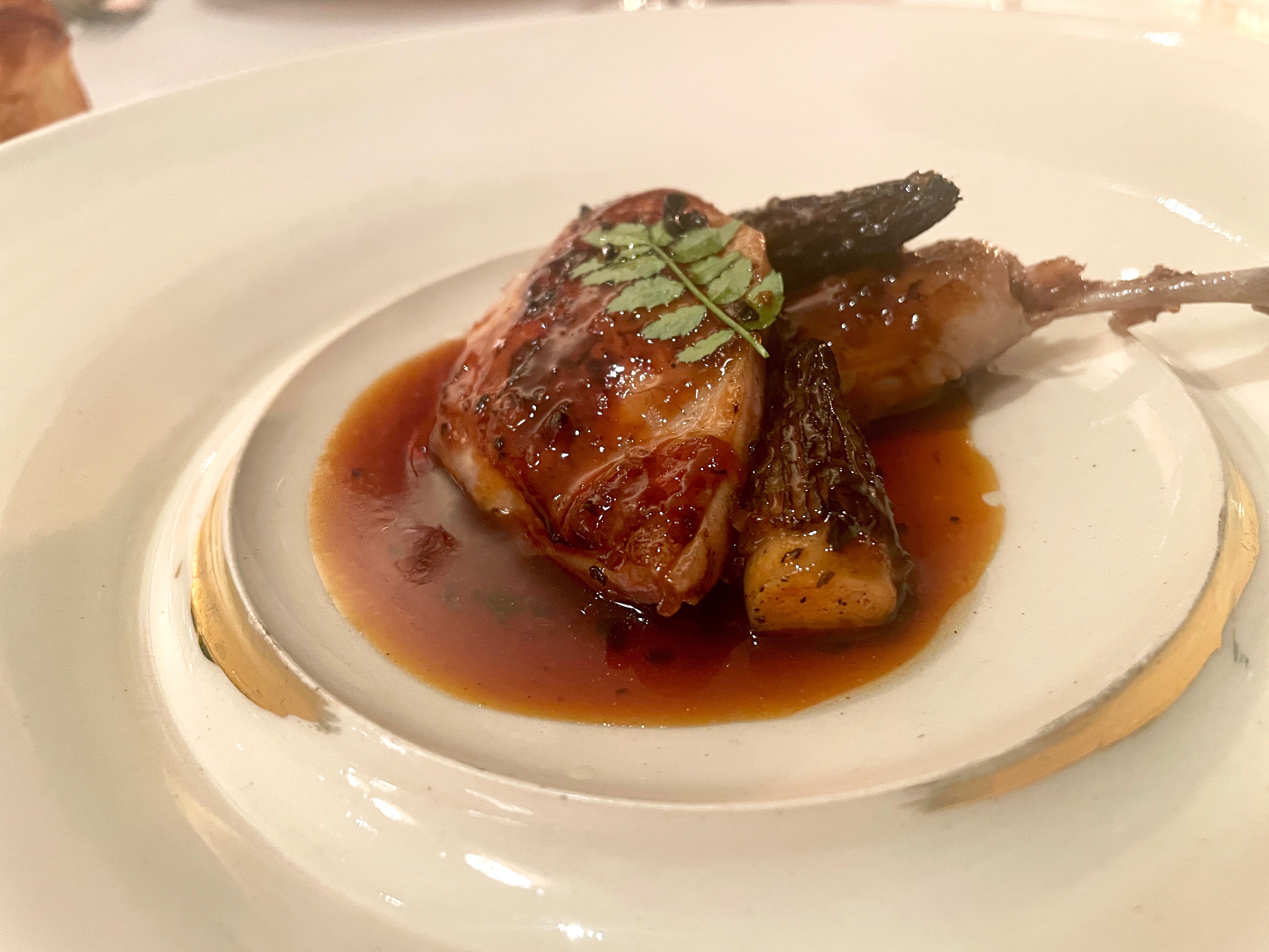 Der Hauptgang präsentiert eine vorzüglich gegrillte Wachtel mit krosser Haut und auf den Punkt getroffenem zartem Fleisch. Die Morcheln dazu sind mit einer Farce von N’duja gefüllt. Die zeigt erst hinten raus eine leichte Schärfe, so dass die tolle intensive, kräftige Jus nicht überdeckt wird. Separat gibt es ein formidables Brioche Feuilletée zum Auftunken der Sauce. Das hätte auch Restaurants mit höchsten Weihen alle Ehre gemacht.