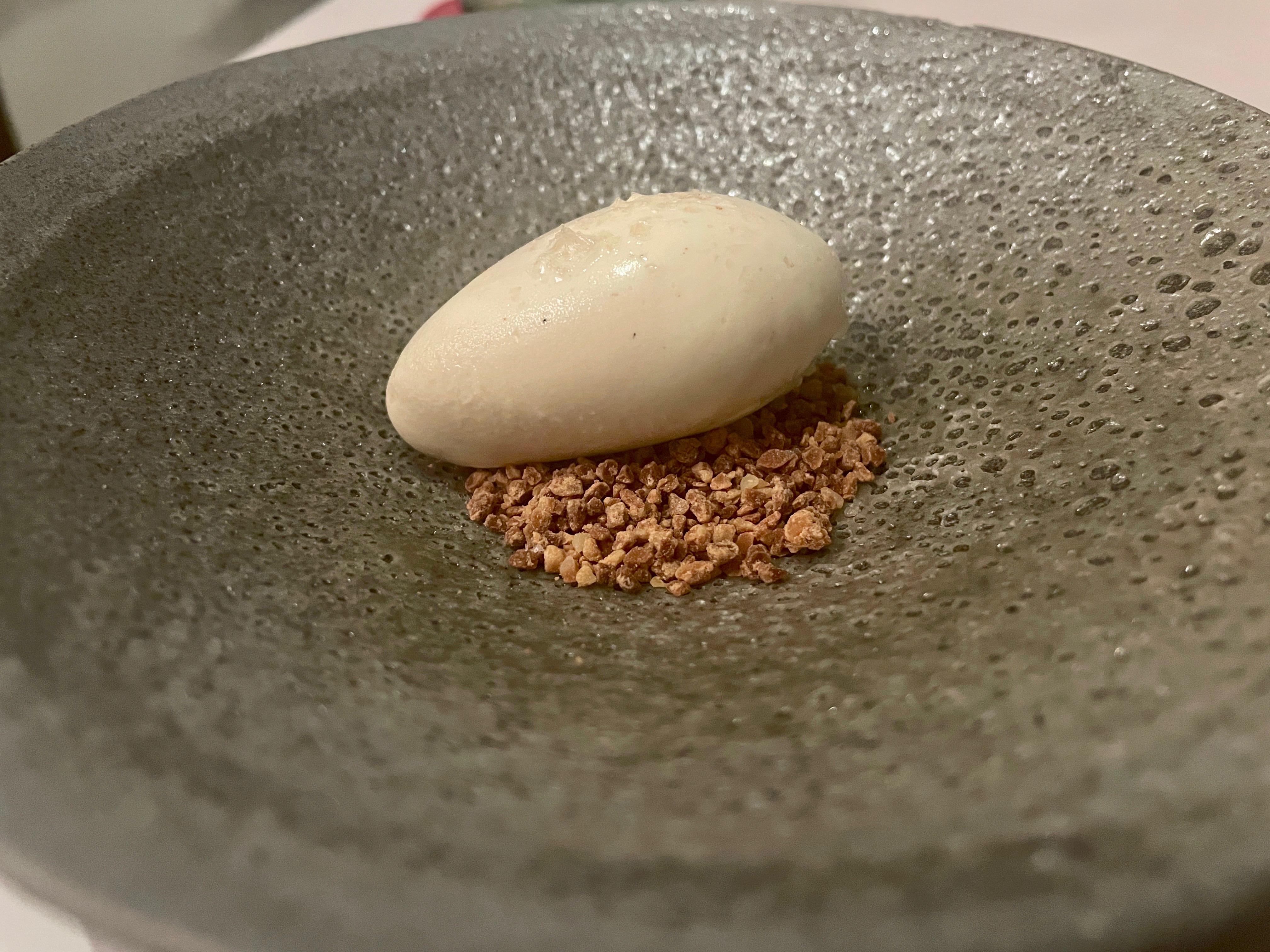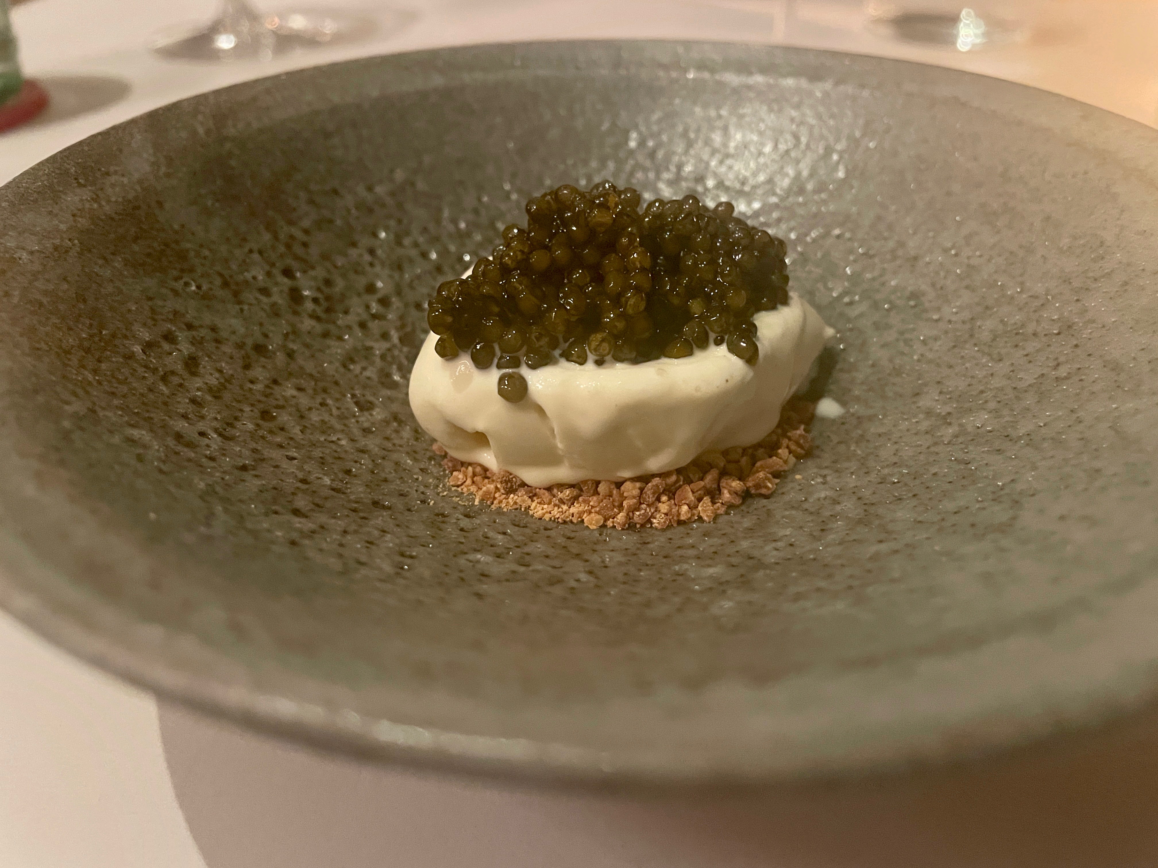 Noch reduzierter wird es mit dem Braune Butter Eis auf karamellisierter weißer Schokolade. Das ist füllig, süß mit Karamellnoten. Steinpilzöl wird auch noch angekündigt, aber das kann ich nicht ausmachen. Optional kann man sich dazu N25 Ossietra-Kaviar bestellen, wovon ich Gebrauch mache. Die Salzigkeit steht dem Dessert sehr gut und hier macht der Kaviar für mich auch Sinn. Gefällt und schmeckt mir.