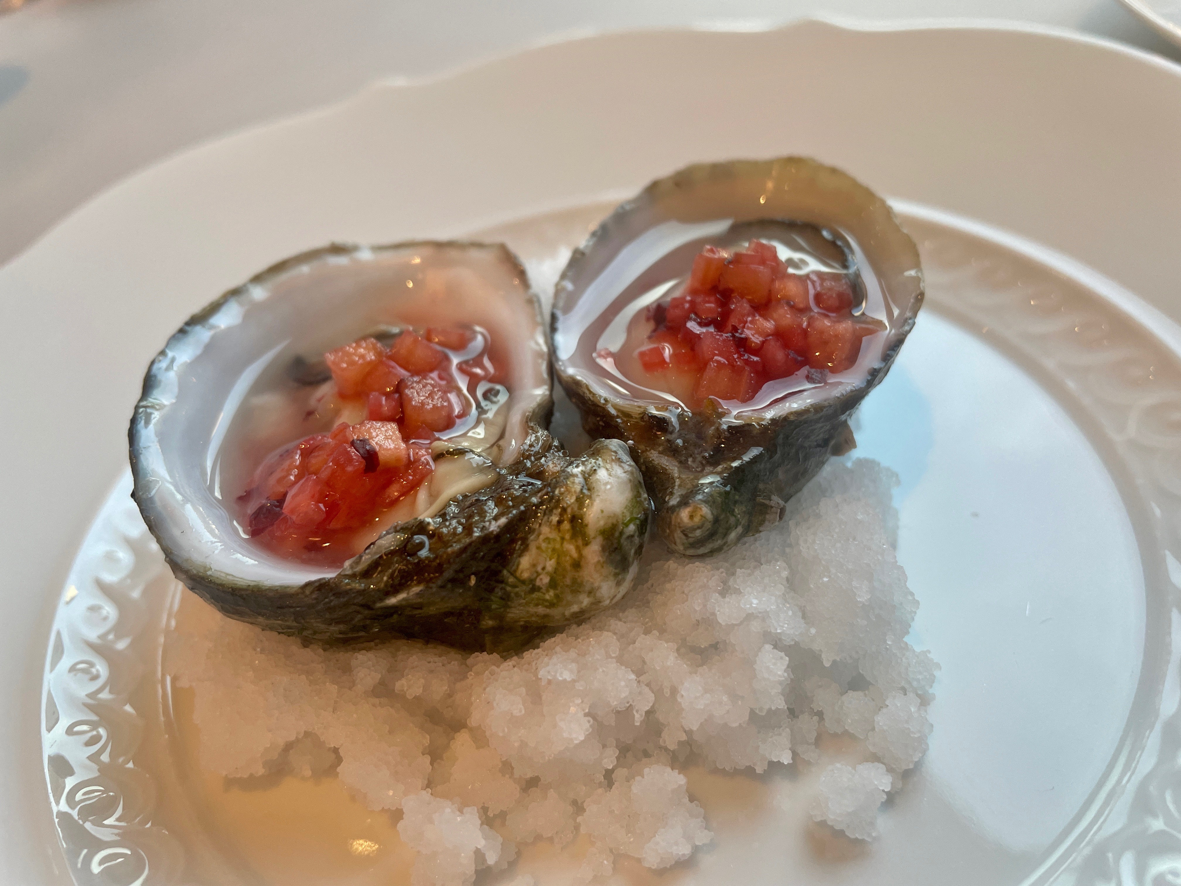 Optional können vorab bretonische Baby KYS-Austern vorab bestellt werden, die es in verschiedenen Versionen gibt. Mein Mann mag es lieber recht naturell, weshalb für ihn die gegrillte Zitrusfrucht am ehesten infrage kommt. Ich entscheide mich für Rhabarber Mignonette, was die milde, fleischige Auster mit einer feinen Säure ergänzt.
