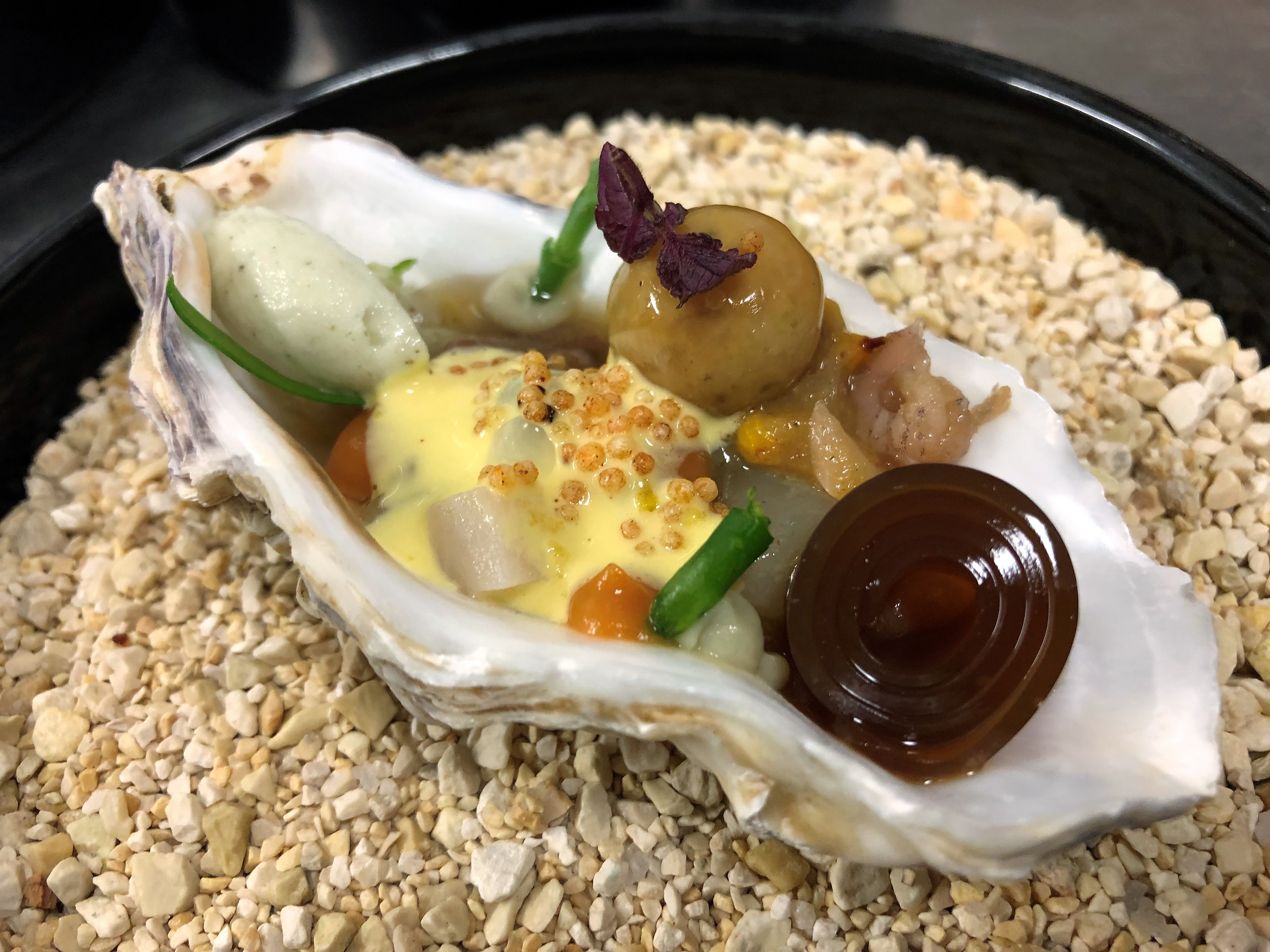 Den Abschluss der Grüße in der Küche macht eine Komposition, die wir, zumindest was einen Gutteil der Zutaten angeht, auch beim letzten Besuch hatten, seinerzeit in einer Jakobsmuschelschale. Heute allerdings findet sich das Tatar von der Jakobsmuschel mit dem Eis vom Schafsmilchjoghurt, Sanddorngelee und weiteren acht Komponenten, darunter Austern- und Bouillabaissecreme, Krustentiergelee und Perlen vom Ostfriesentee noch komprimierter in einer einzigen Austernschale. Das kann fast ein wenig zu viel sein, denn die zweifellos handwerklich aufwändig hergestellten Bestandteile können so kaum richtig zur Geltung kommen. Andererseits vermittelt sich die Idee eines norddeutschen Geschmacksakkords unmittelbar.