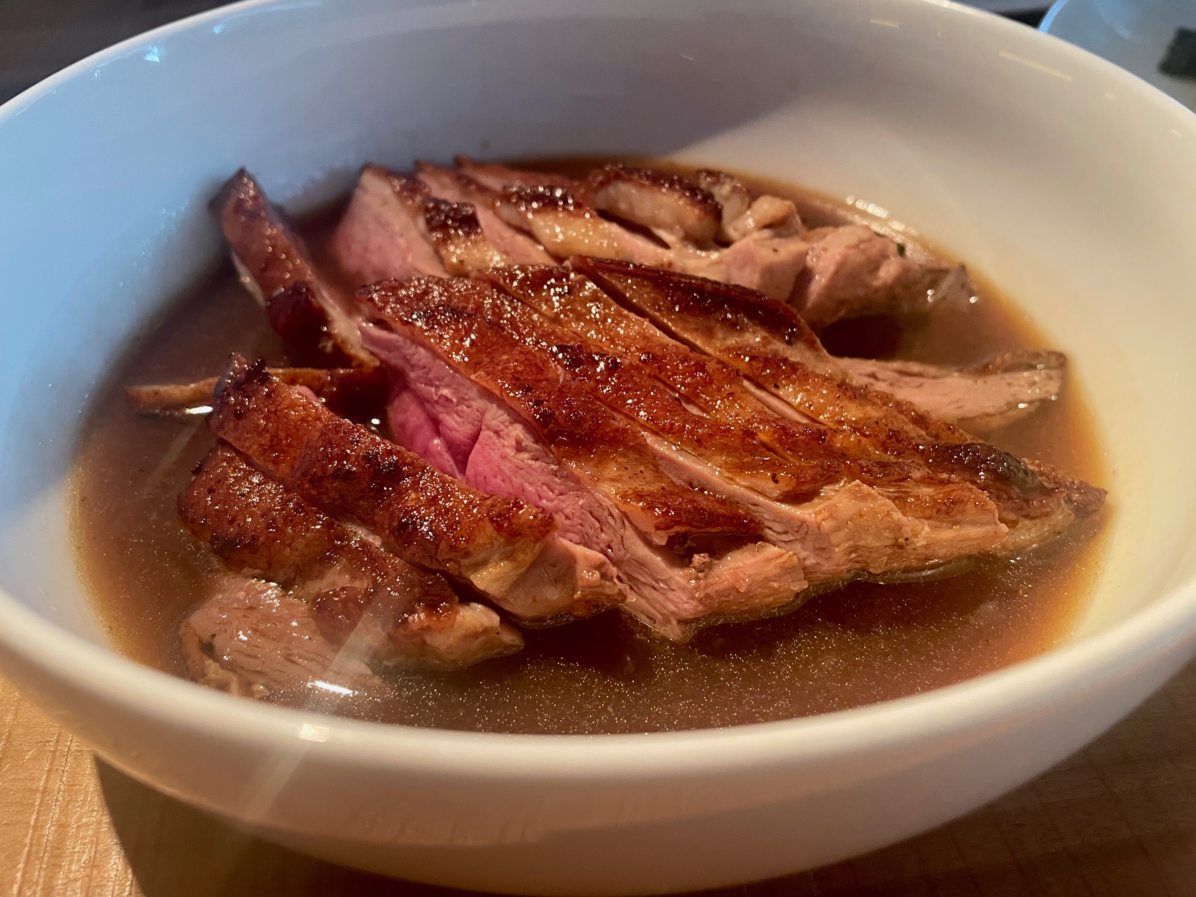 bevor es mit einer dampfenden Brühe, die aus den Karkassen und Gemüsen gezogen wird, ins Menü startet. Und die hat es in sich: dicht, tiefgründig und hocharomatisch hat sie alles, was Liebhaber von konzentrierten Suppen, eigentlich schon fast eher einer Bouillon, lieben. Darin schwimmt zudem ein seidenweicher Dumpling mit einer Füllung aus dem Fleisch der Keulen, Herz und Leber. Einfach wunderbar und lange nachhallend.