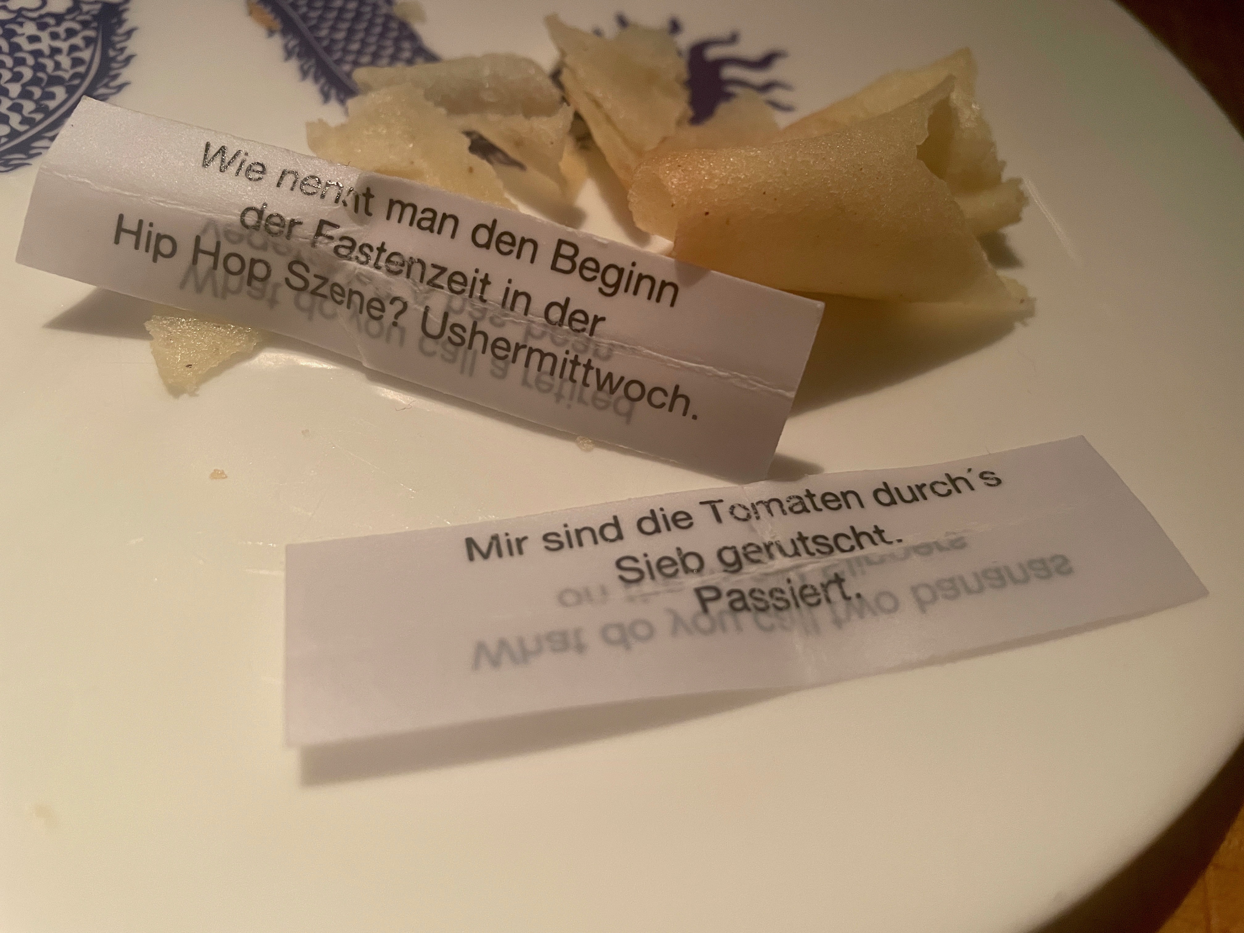 Das Menü selbst bietet kein Dessert, aber natürlich könnte man sich aus der regulären Karte noch eines bestellen, wenn man denn noch die Kapazitäten hätte. Wir sind so gut gesättigt, dass wir darauf verzichten und begnügen uns mit den hausgebackenen Glückskeksen, die zur Abwechslung mal nicht konfuzische Weisheiten enthalten, sondern launische, aber gut gelungene Wortspielwitze.