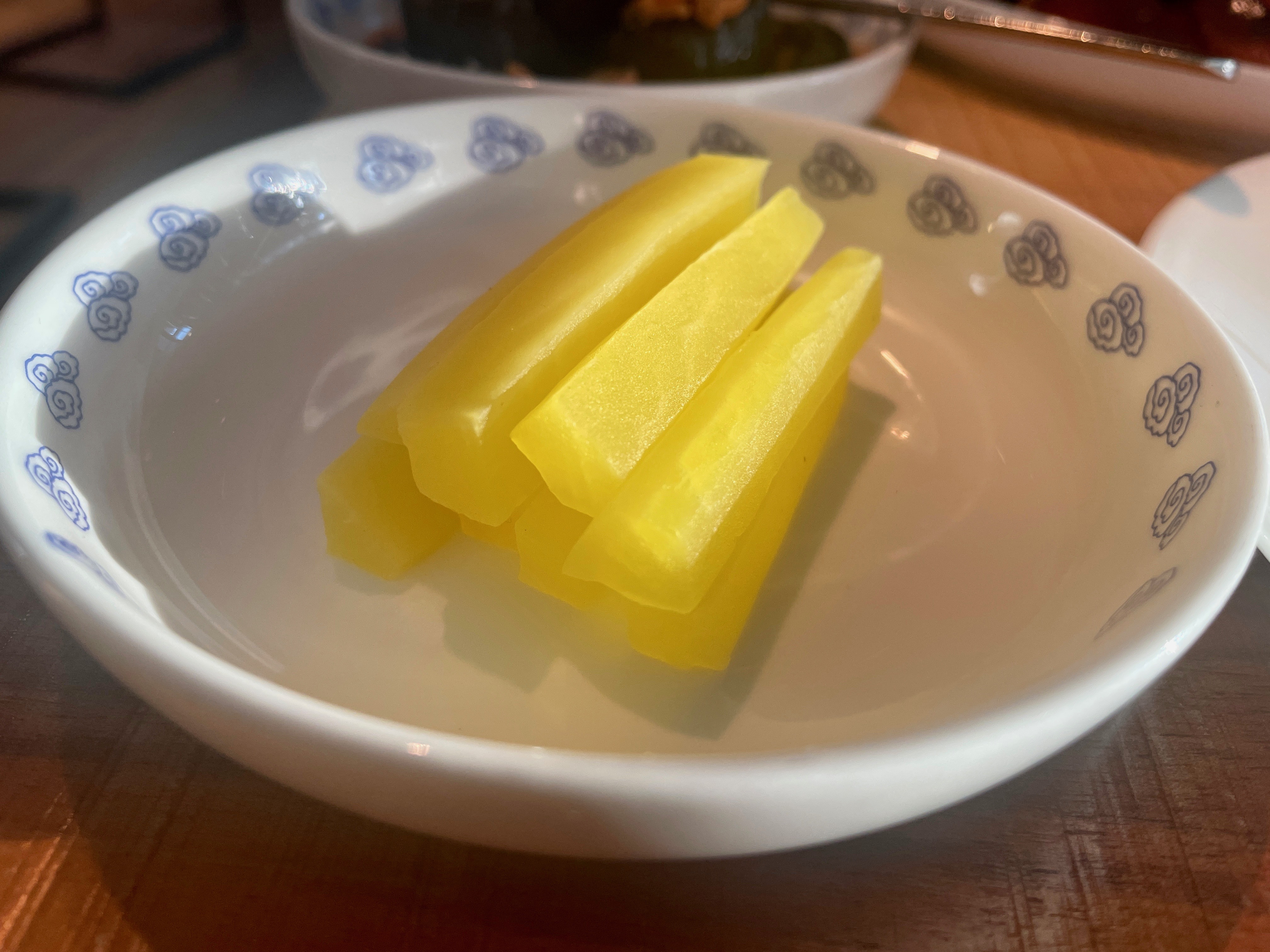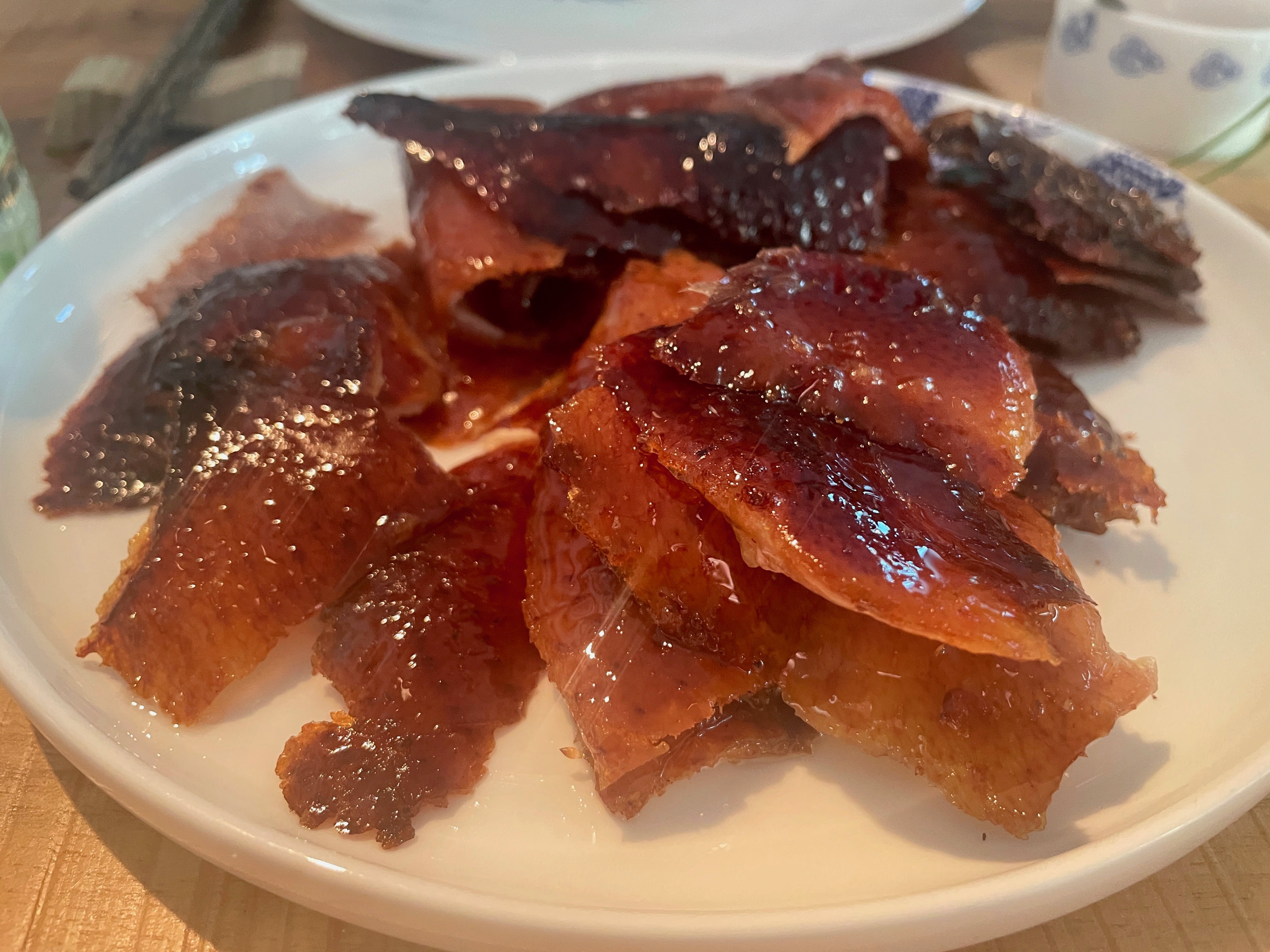 Zu der in handliche Stücke geschnittenen Haut gibt es diverse Beilagen, die der Gast in Pfannkuchen einwickelt, als da wären eingelegter Ingwer, Frühlingszwiebeln, Hoisin-Sauce, brauner Zucker und marinierter Rettich. Ist die Haut für sich genommen für meinen Geschmack etwas zu süß, spielt sie aber ihr volles Aroma in Kombination mit dem säuerlichen Gemüse und den Pancakes wunderbar aus.
