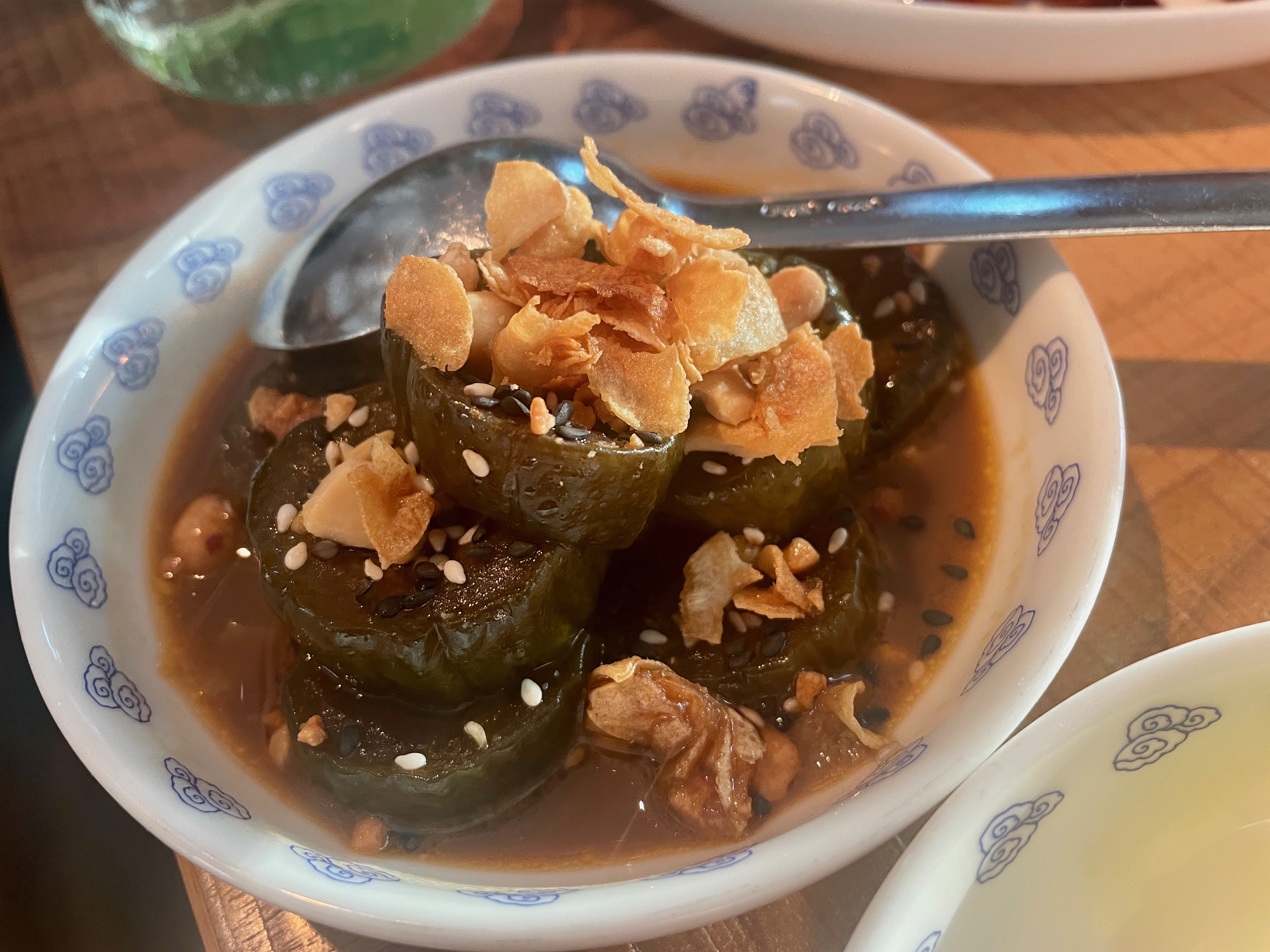 Zum Zwischendurchessen gibt es noch eingelegte Gurken mit Cashewkernen und Knoblauchflakes, die ebenfalls gekonnt zwischen Süße, Säure und Schärfe pendeln.