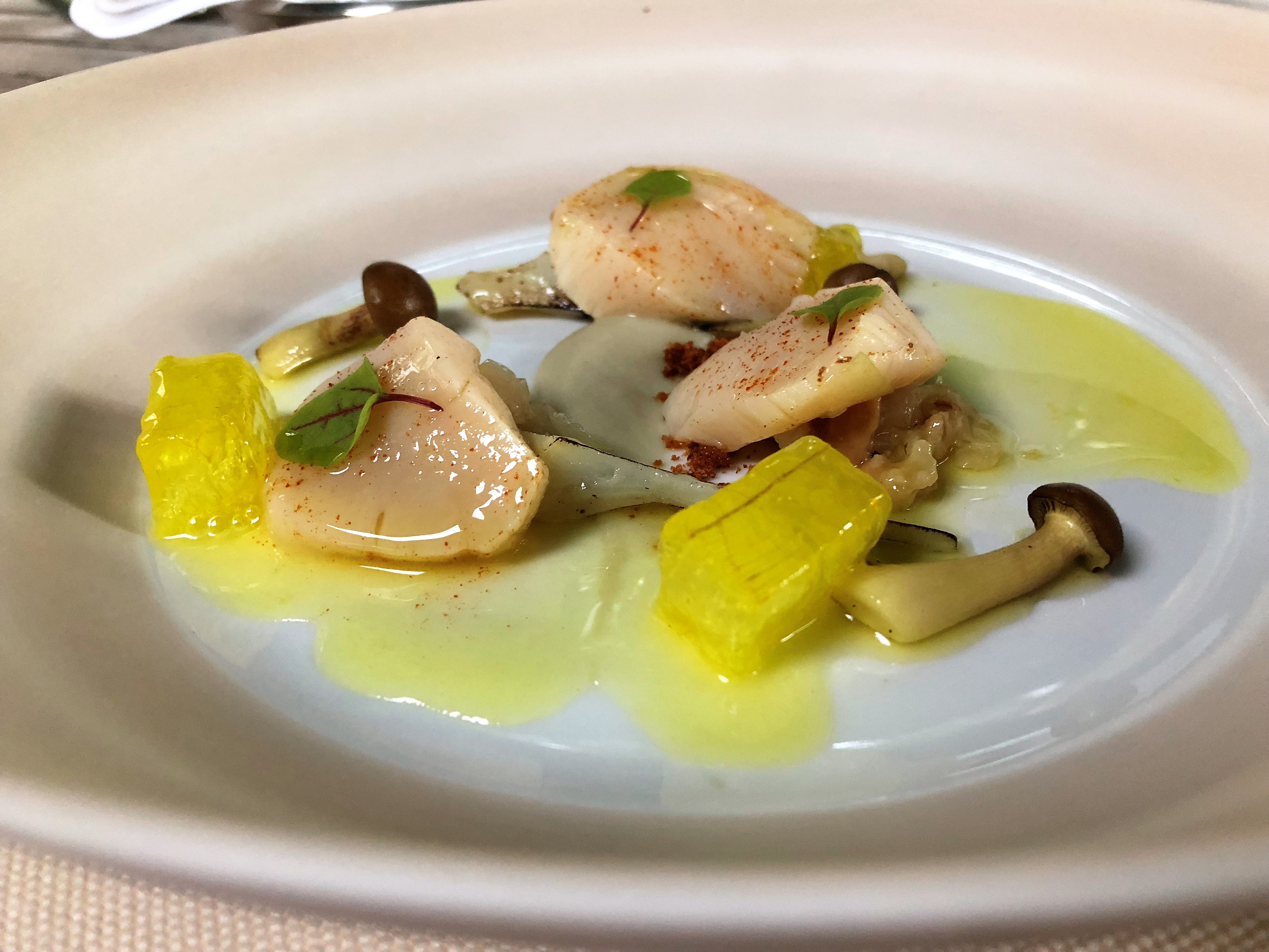 Nach diesem doch recht aromenstarken Auftritt schaltet die Küche einen deutlichen Gang zurück. Die Jakobsmuschel ist nur leicht ansautiert, was ich normalerweise nicht so mag, denn ich finde gerade Röstnoten oftmals viel passender. In diesem Gericht allerdings stellt Harald Rüssel bewusst die Frische und Jodigkeit in den Vordergrund und unterstützt diesen Eindruck mit einem Aloe Vera-Gelee und Zitrusaromen. Artischocken und Buchenpilze ordnen sich hier auch nur dezent unter. Topinambur als Crumble steuern etwas Textur bei. Überraschend und gut.
