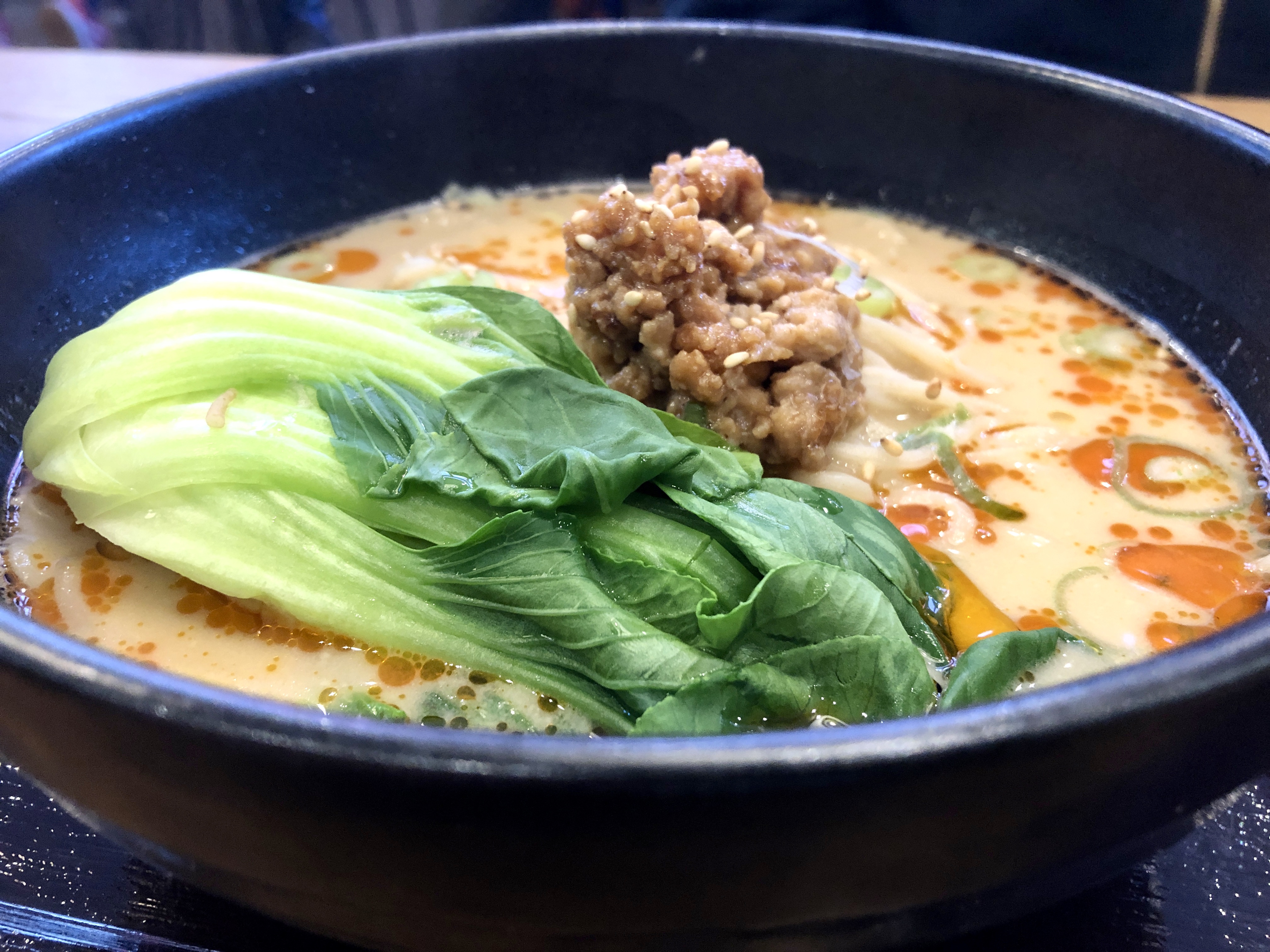 Noch begeisternder ist die zweite Suppe, die wir an diesem Tag probieren, eine Tantan-Men, die, obwohl auf der selben Grundbrühe basierend, auch optisch schon ganz anders daher herkommt. Sesampaste, Chiliöl und Miso-Hühnerhackfleisch sorgen für einen mundfüllenden Geschmack, der uns das pure Erstaunen ins Gesicht zaubert. Und dann kommt das große Grinsen, weil es so unfassbar lecker ist. Separat gibt es noch eine scharfe Würzpaste, mit der man die eh schon gute Suppe zusätzlich aufpimpen kann. Aber eigentlich ist das gar nicht nötig. Wir müssen lange überlegen, wann wir zuletzt eine derart starke Suppe gegessen haben.