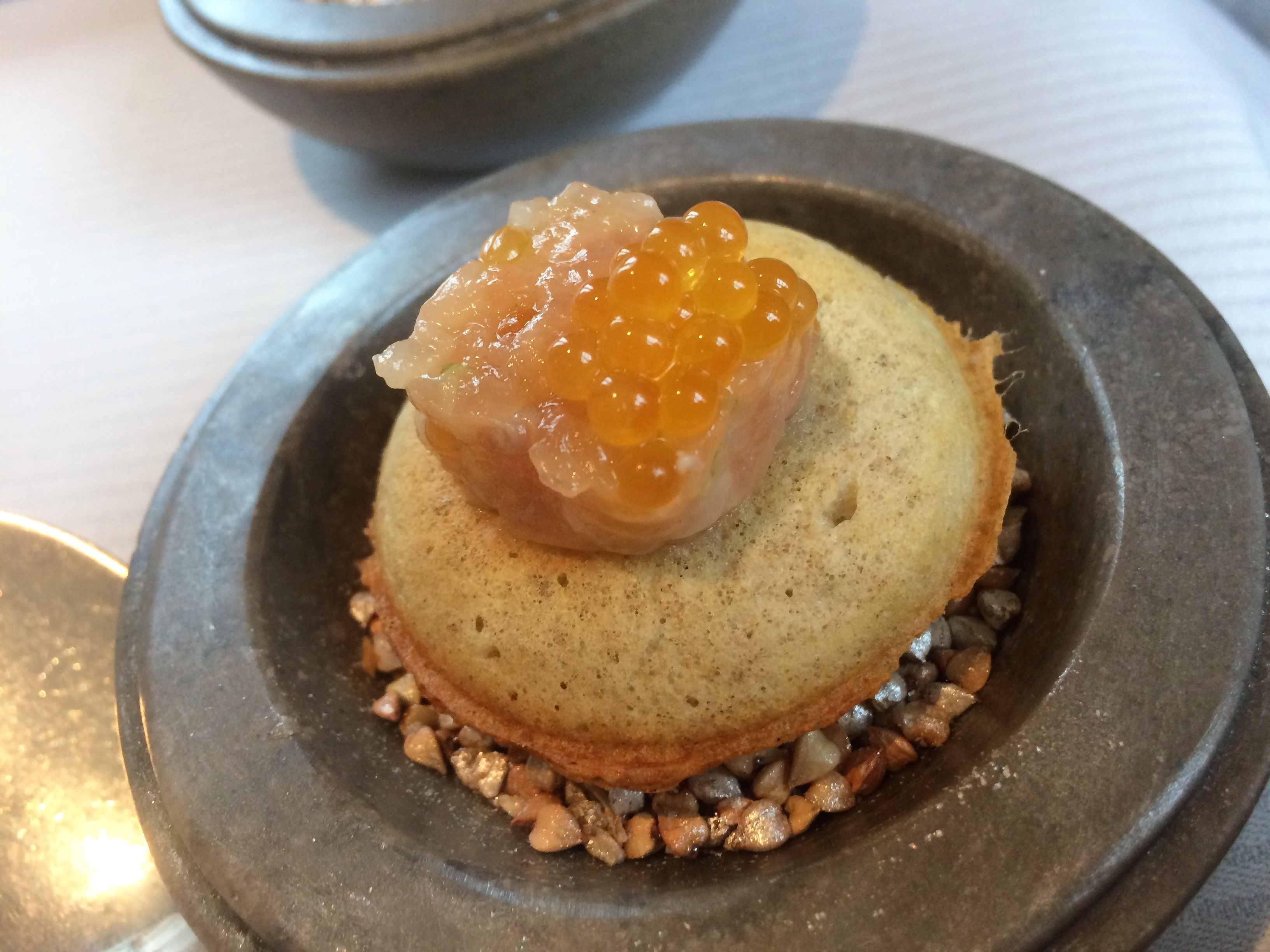 Es folgt Saibling aus dem Lechtal, von wo Joachim Wissler häufig seine Fische bezieht. Und auch dieses leicht geräucherte Exemplar ist von ausgezeichneter Qualität und perfekt gegart. Das Gericht ist von grünem Spargel und einer milden Topinambur-Meerrettichbutter relativ klassisch eingefasst. À part gibt es, wie häufig zu den Lechtal-Fischen, den fluffigen Blini, diesmal mit Saiblingstatar, aber wie so oft, unter der mit Rauch gefüllten Glasglocke.