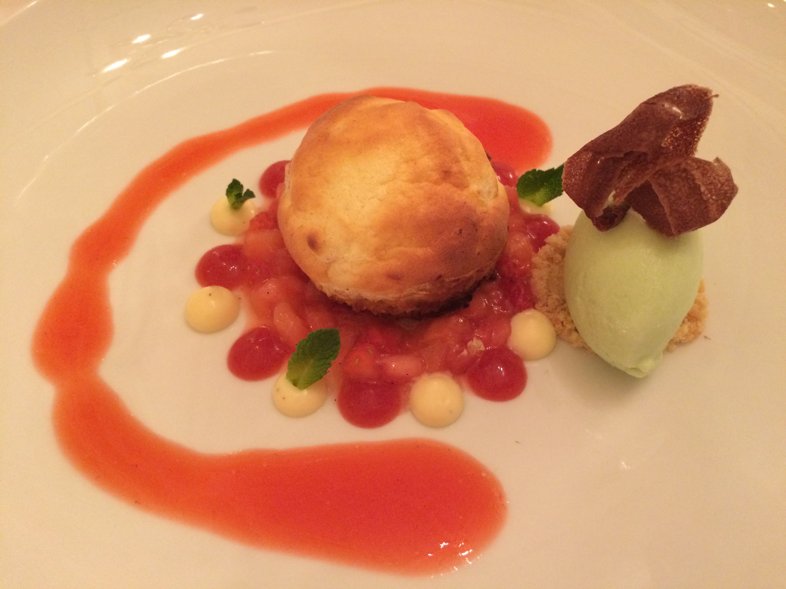 Das dann folgende Dessert gehört für mich zu den schwächsten auf unserer Reise. Ein soufflierter Rhabarber-Bisquit hat für mich keine besonders ansprechende Konsistenz und wirkt wie ein kleiner Rührkuchen, also eher banal. Gleiches gilt für das Erdbeerkompott und die Erdbeersauce. Das Basilikumeis ist gut, hebt das Gericht aber auch nicht mehr in den Stand von etwas Besonderem.