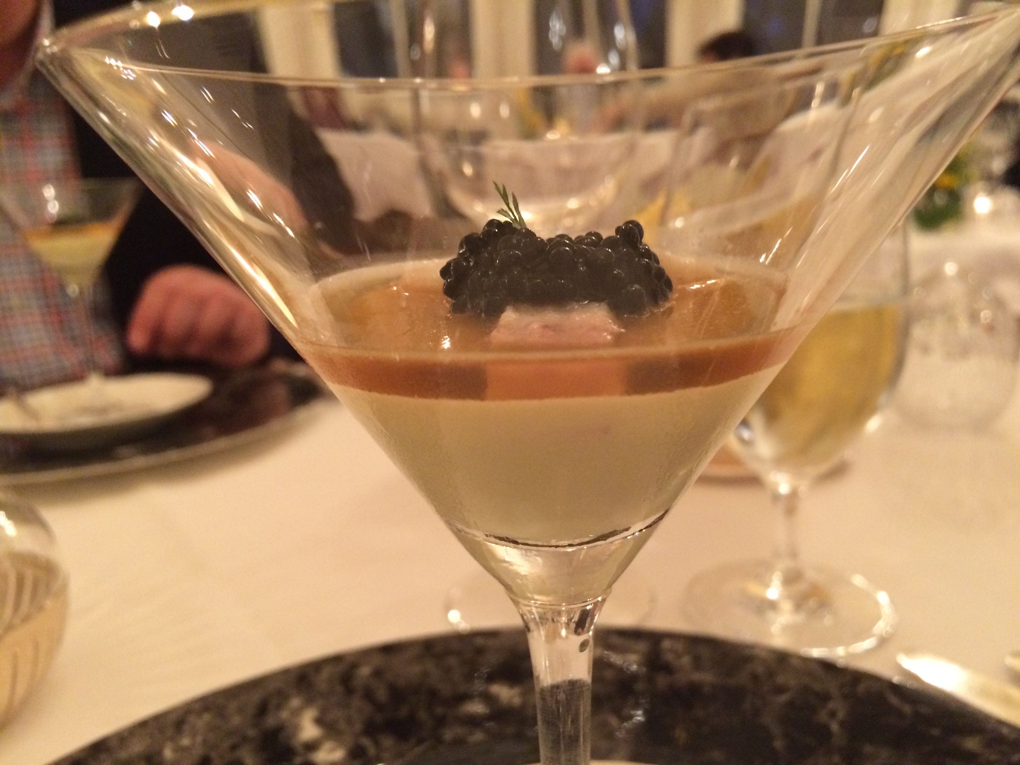 Unser Einstieg ins Menü beginnt vorzüglich. Als erster Gruß erreicht uns eine Creme Vichssoise im Martiniglas mit Krustentiergelee, Räucheraal und einer gut dosierten Menge Kaviar. Das ist in Konsistenz und Ausführung perfekt und der Geschmackakkord ist fast schon dekadent süchtg machend.